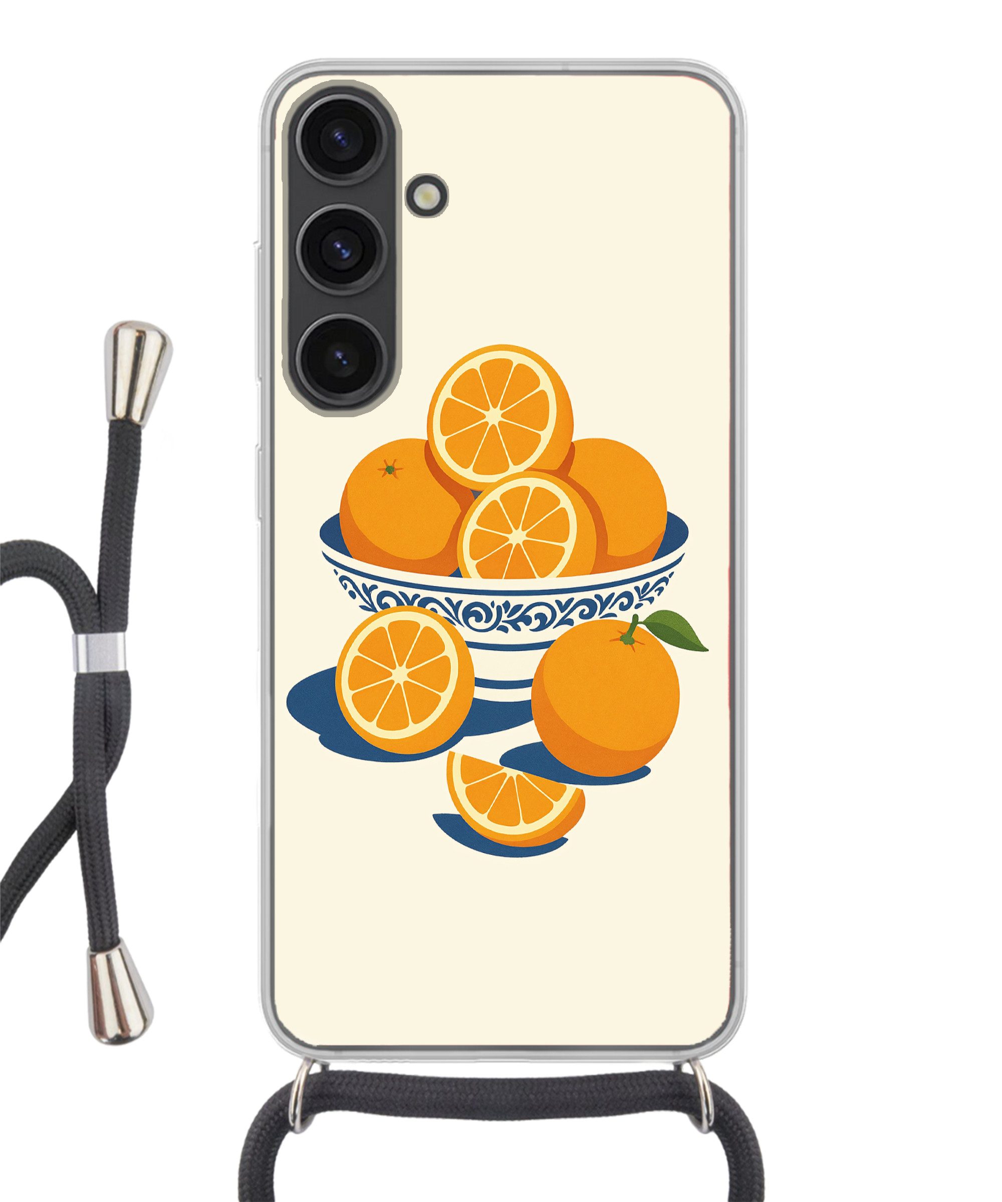 Eine weiße Schale mit blauem Dekor ist mit ganzen und halben Orangen auf blassgelbem Grund gefüllt.