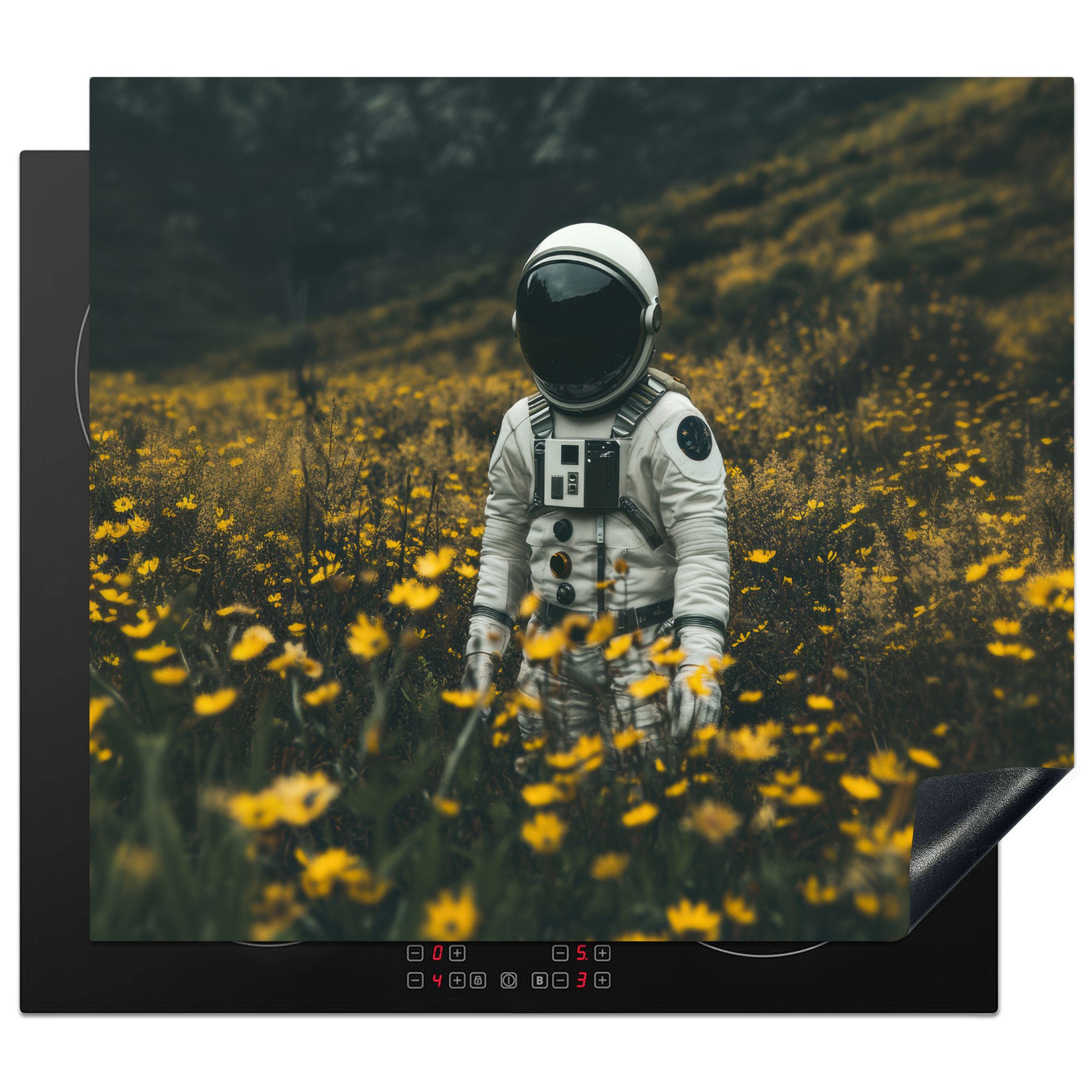 Ein Astronaut entspannt sich in einem rosafarbenen Flamingo-Badeanzug und schwebt im Weltraum, während unter ihm ein Planet zu sehen ist.