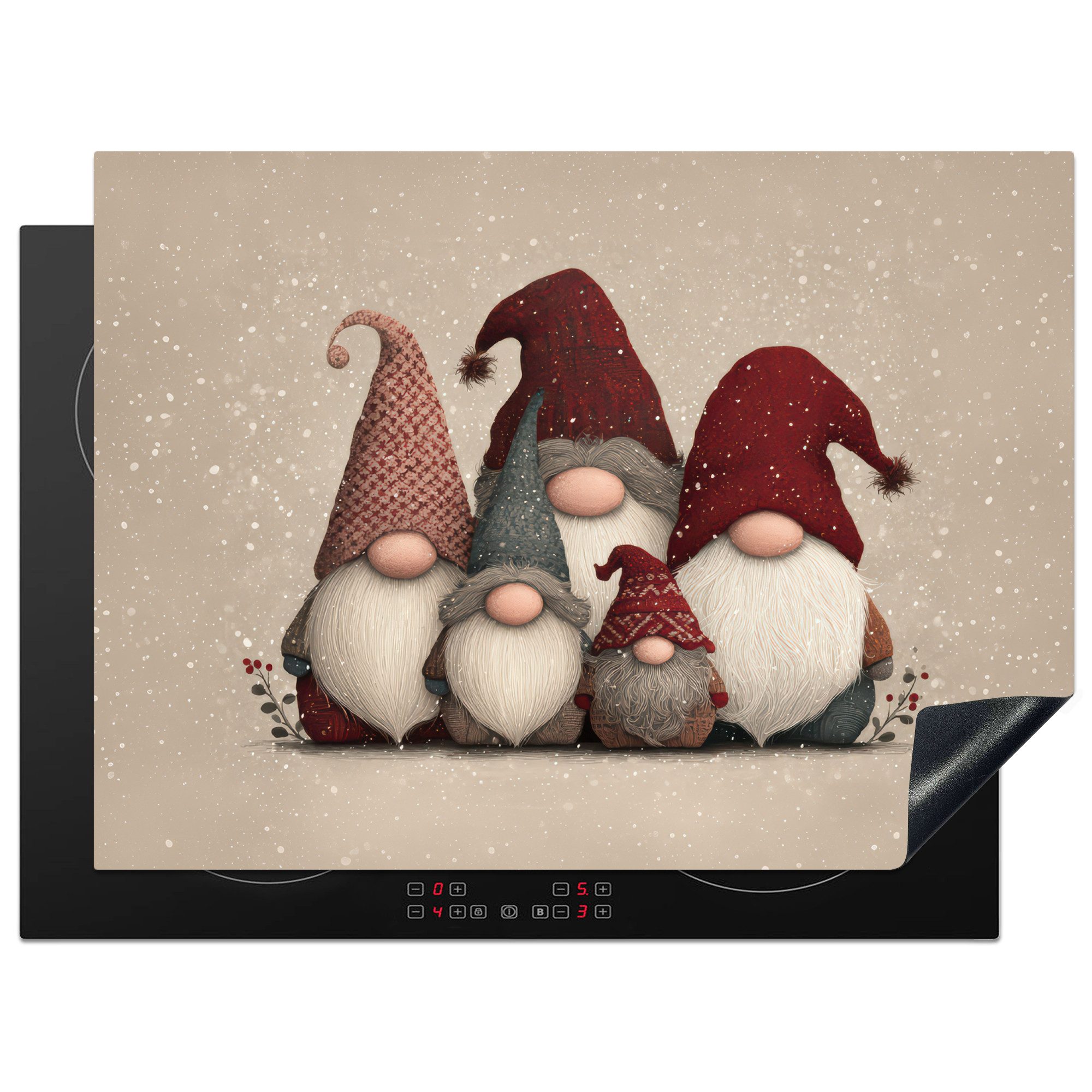 Fünf Weihnachtswichtel mit großen runden Nasen und langen weißen Bärten stehen gemütlich zusammen im Schnee. Sie tragen spitze Mützen in Rot, Grau und Braun mit verschiedenen Mustern. Der Hintergrund ist ein ruhiges Beige mit fallenden Schneeflocken. Eine warme und charmante Winterillustration.