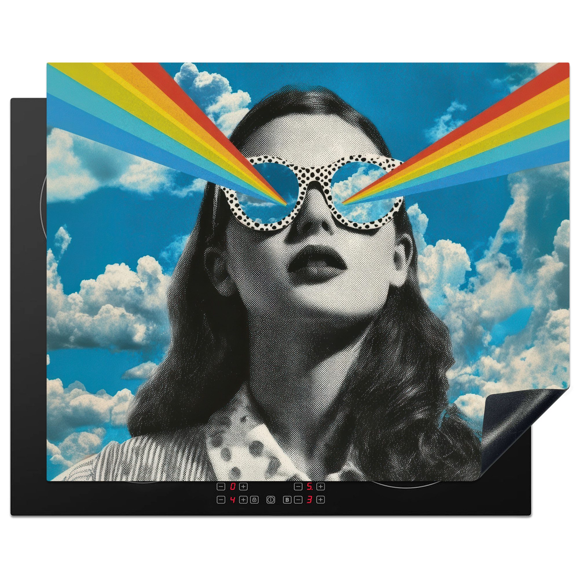 Ein Schwarz-Weiß-Porträt einer Frau mit gepunkteter Sonnenbrille steht vor einem blauen Himmel voller Wolken. Aus der Brille schießen Strahlen in Regenbogenfarben hervor, die einen dynamischen Kontrast zwischen der monochromen Figur und dem lebendigen Himmel bilden.