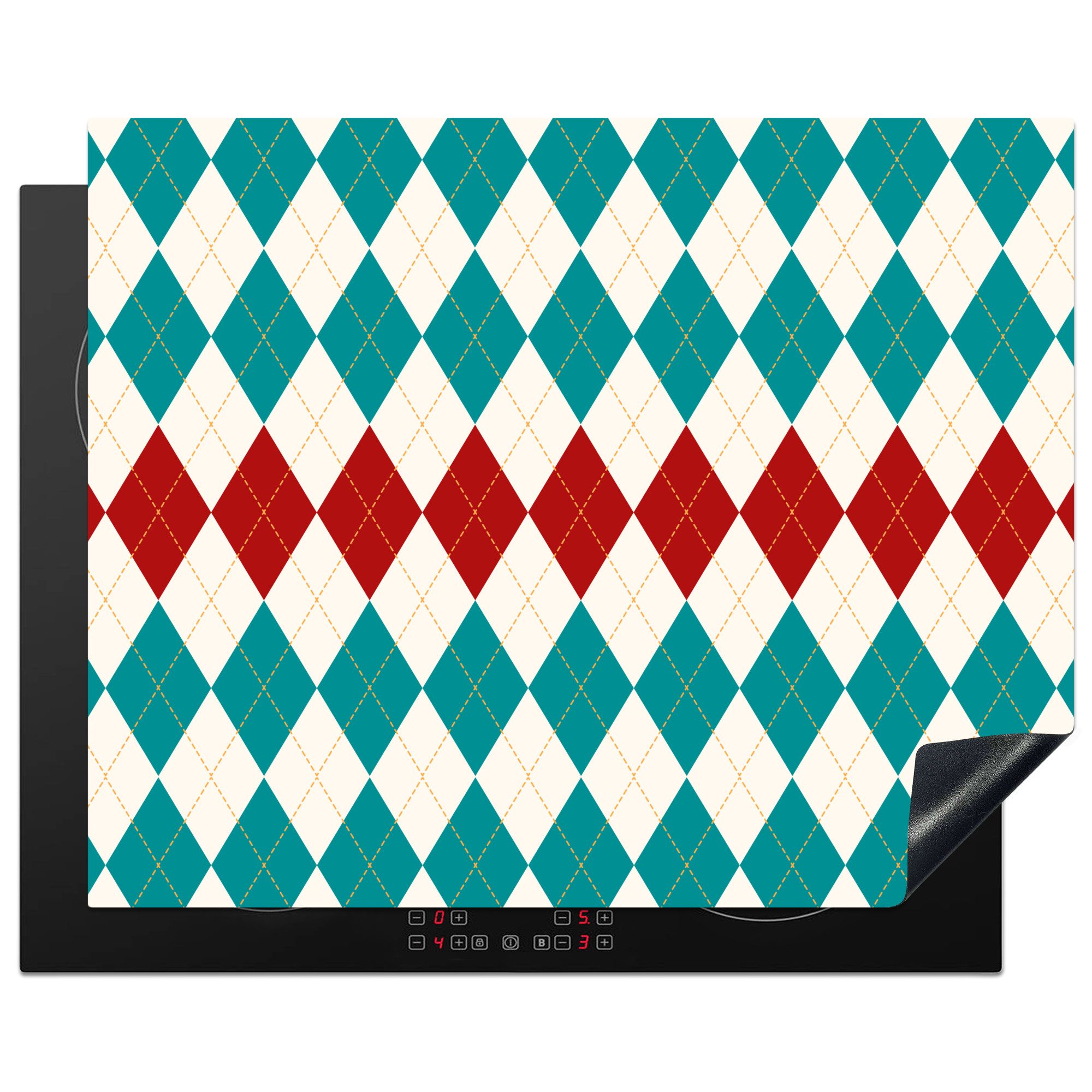 Illustration mit abwechselnden Rauten in Rot und Grün auf hellem Hintergrund. Orangefarbene diagonale gepunktete Linien ziehen sich durch das Design und verstärken das klassische und festliche Rautenmotiv.