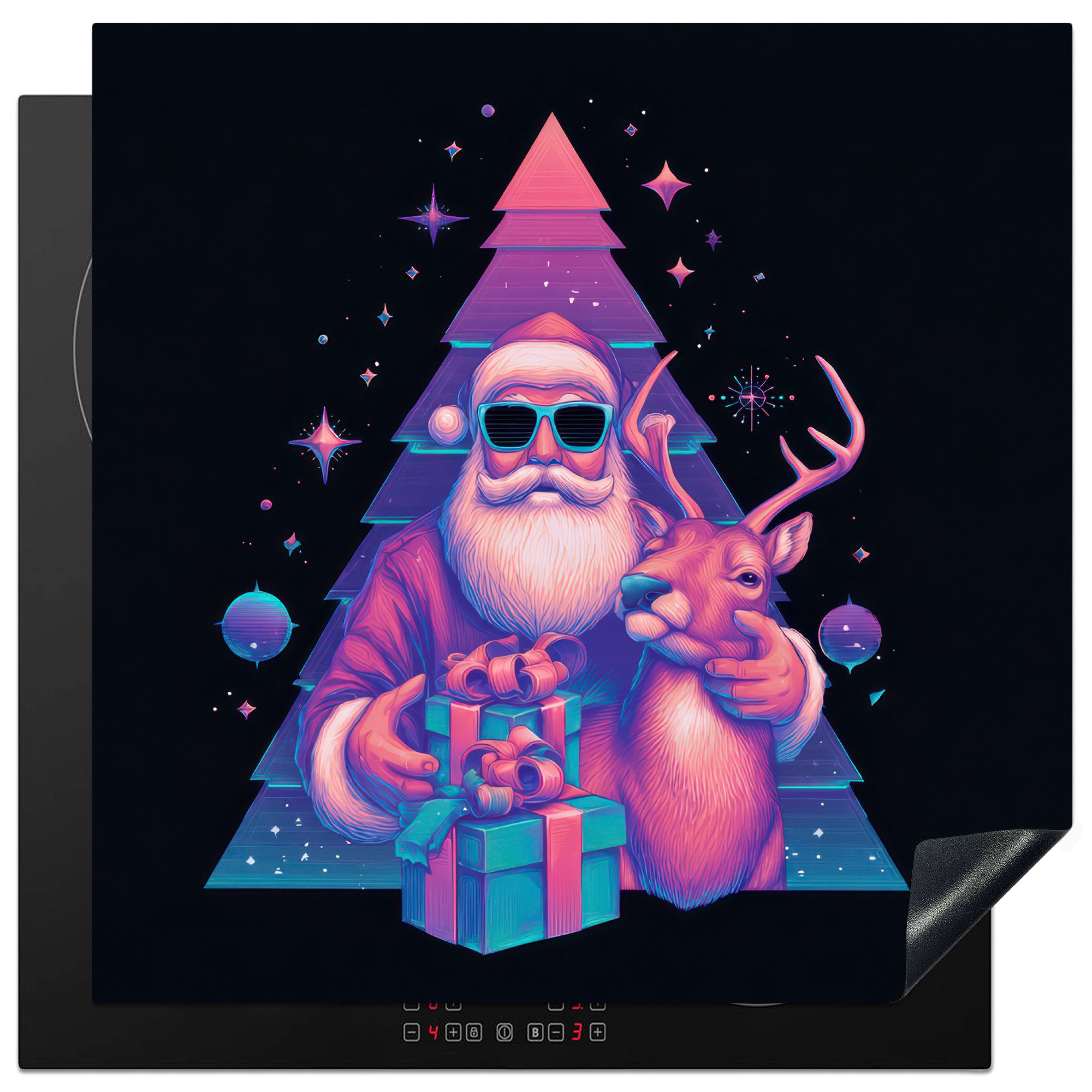 Ein modernes und mutiges Bild des Weihnachtsmanns mit einem Rentier an seiner Seite. Beide tragen Sonnenbrillen, und der Weihnachtsmann hält einen Stapel bunter Geschenke in der Hand. Der Hintergrund besteht aus einem stilisierten Weihnachtsbaum mit weltraumähnlichen Elementen wie Planeten und Sternen. Die Verwendung der Farben Pink, Lila und Blau erinnert an einen Retro-Synthwave-Stil. Ideal für Weihnachtsdesigns mit einer Anspielung auf die 1980er Jahre oder Popkultur.