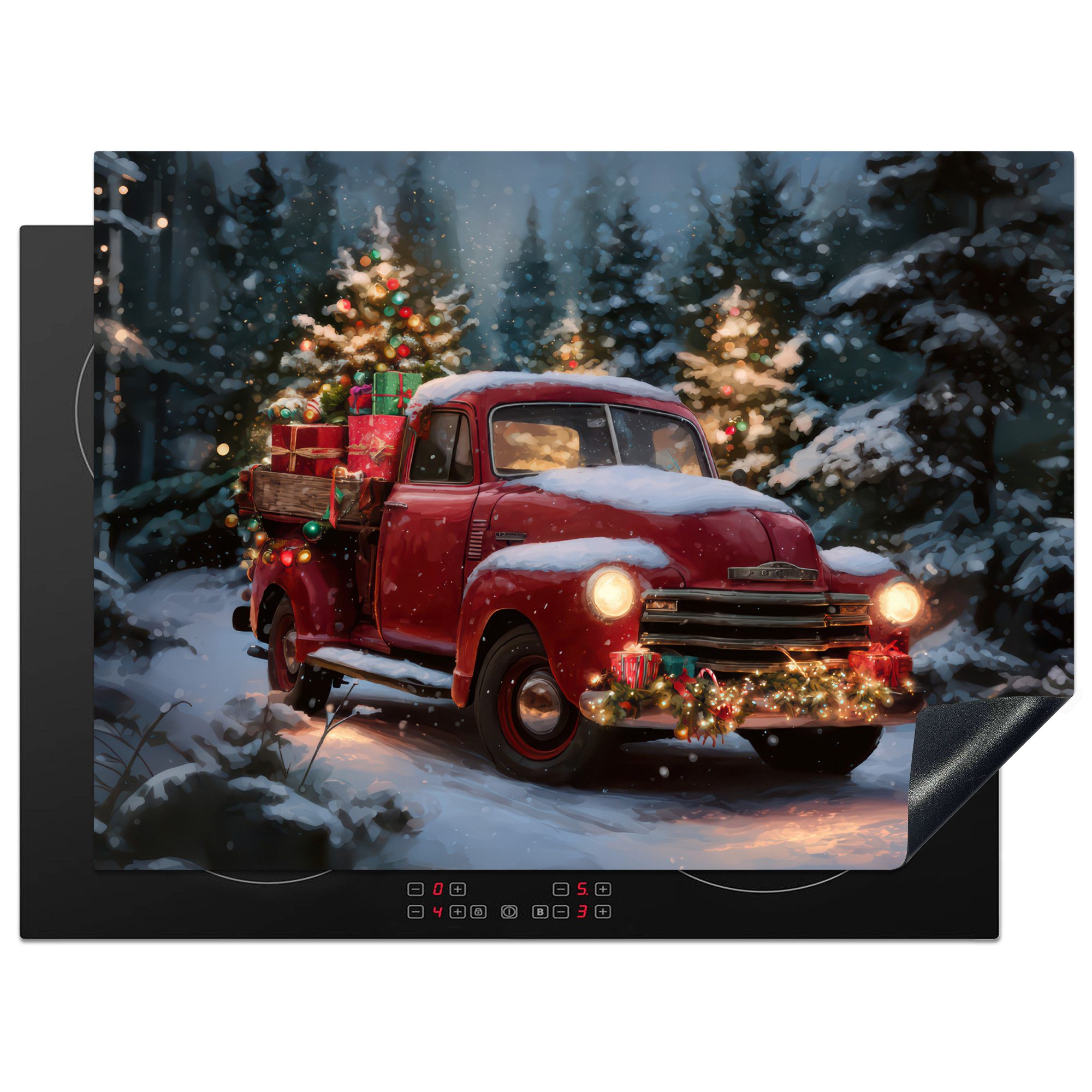Ein leuchtend roter, mit Geschenken beladener Lastwagen steht in einem verschneiten Wald, umgeben von beleuchteten Weihnachtsbäumen. Schneeflocken wirbeln herunter, während die Scheinwerfer und die Weihnachtsbeleuchtung an der Stoßstange eine warme Atmosphäre schaffen. Die Szene strahlt Nostalgie und Festlichkeit aus.