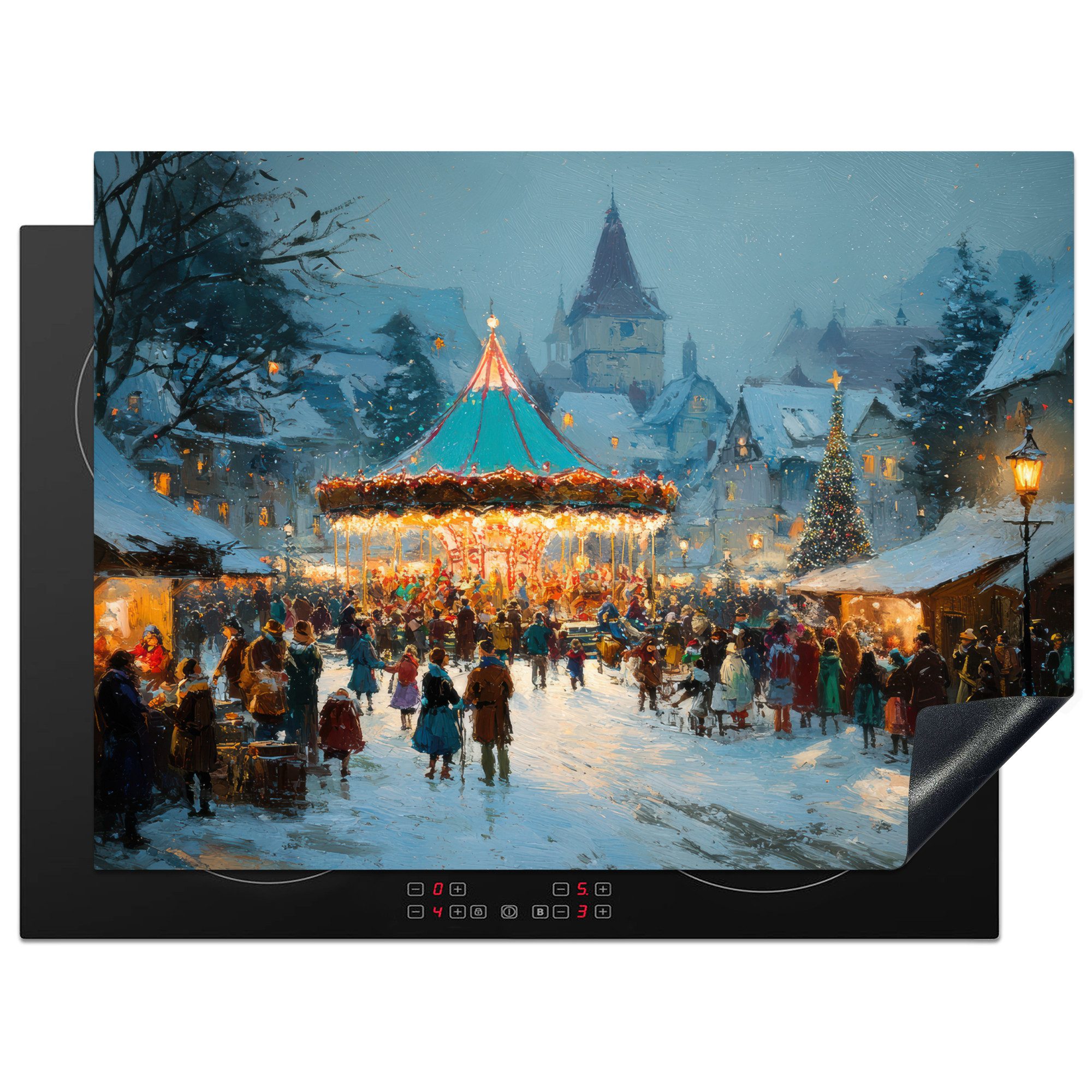 Ein großer beleuchteter Weihnachtsbaum steht im Mittelpunkt eines verschneiten Platzes, umgeben von historischen Gebäuden mit warmen Lichtern. Die Menschen schlendern an Geschäften vorbei und unter verschneiten Bäumen hindurch, während die Schneeflocken herabfallen. Der Vollmond wirft ein sanftes Licht auf den festlichen und märchenhaften Abend in der Stadt.