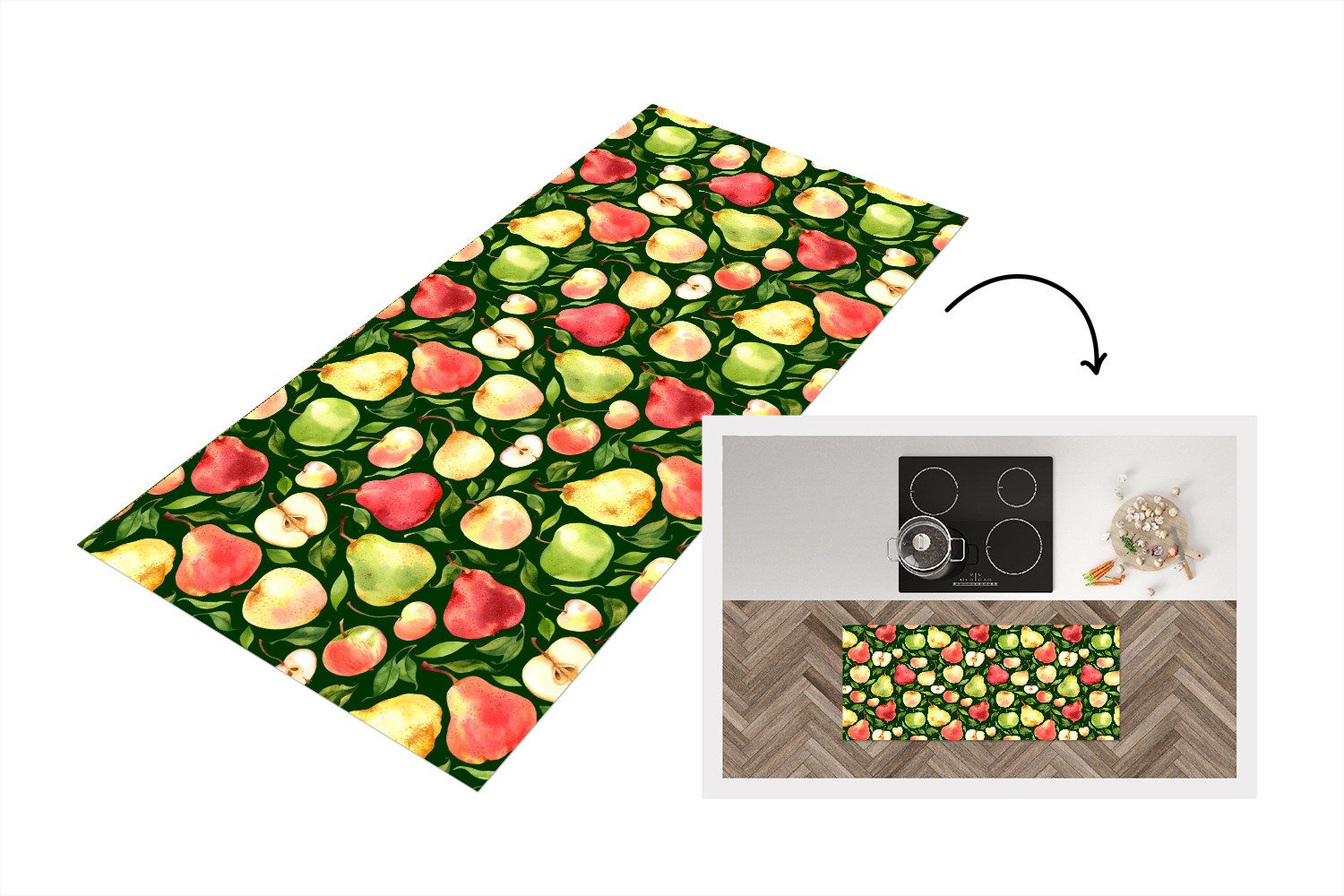 Sich wiederholendes Muster mit bunten Äpfeln und Birnen in sanften Aquarelltönen, teils ganz, teils geschnitten. Der dunkelgrüne Hintergrund bildet einen starken Kontrast zu den hellen Früchten und den zartgrünen Blättern und verleiht dem Ganzen ein reiches, natürliches Aussehen.