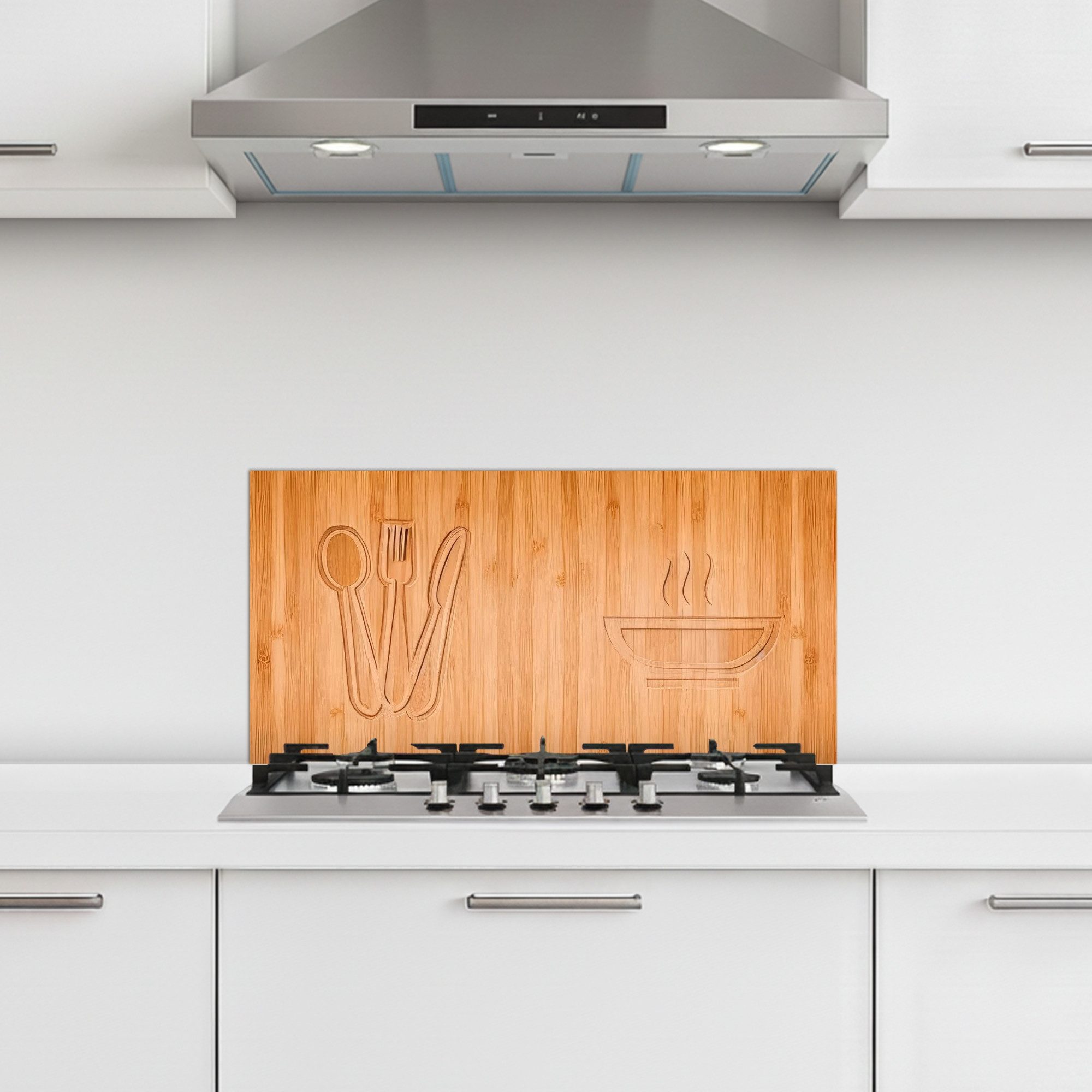 Druck von Besteck und Suppe in eine Holztextur geschnitzt.