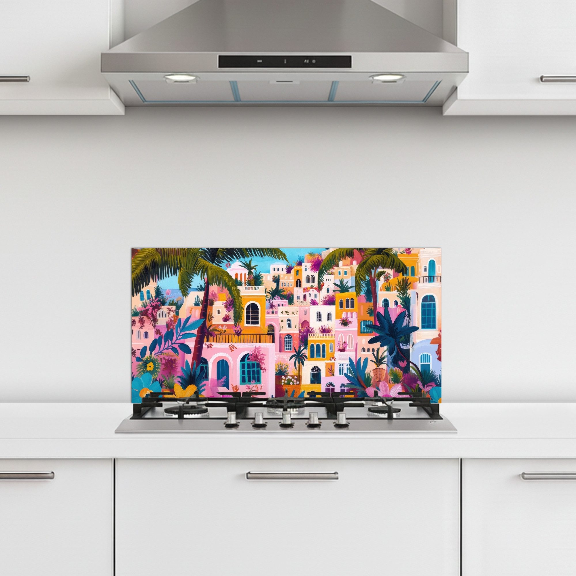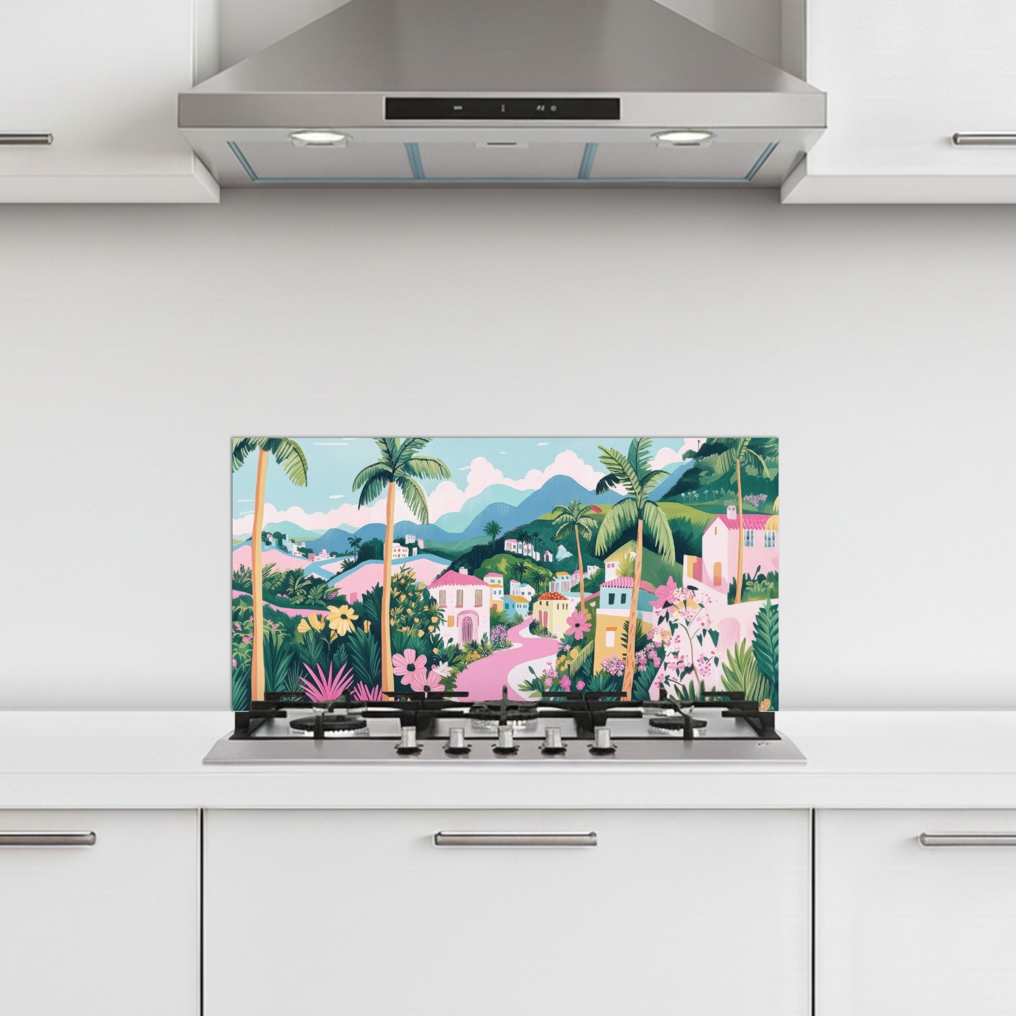 Ein malerisches Dorf mit bunten Häusern, umgeben von grünen Hügeln und Palmen. Die kurvenreiche rosafarbene Straße führt durch eine üppige Landschaft, während Blumen und frische Luft die Szene erhellen.