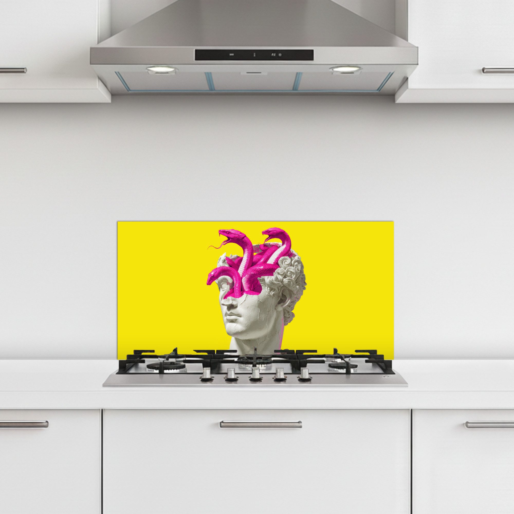 Eine klassische Marmorbüste wurde digital manipuliert: Aus dem zerbrochenen Kopf schlängeln sich leuchtend rosa Schlangen heraus. Der Hintergrund ist einfarbig gelb, was den Kontrast zwischen antik und modern noch verstärkt. Das Werk verbindet klassische Bildhauerei mit surrealer Pop-Art.