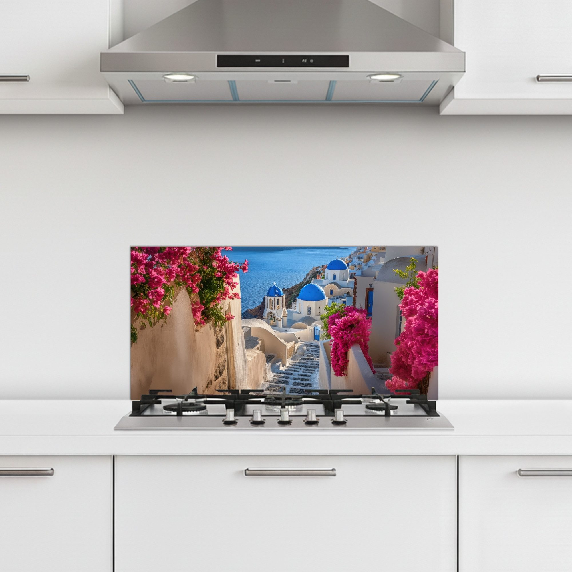 Ein gewundener, weiß getünchter Weg führt zu den berühmten blauen Kuppelkirchen von Santorin, die von farbenfrohen Bougainvillea umgeben sind. Das klare blaue Meer der Ägäis glitzert in der Sonne, während sich die traditionellen weißen Häuser mit blauen Akzenten harmonisch an die Klippen schmiegen. Die warme mediterrane Atmosphäre strahlt Ruhe und Romantik in dieser idyllischen griechischen Umgebung aus.