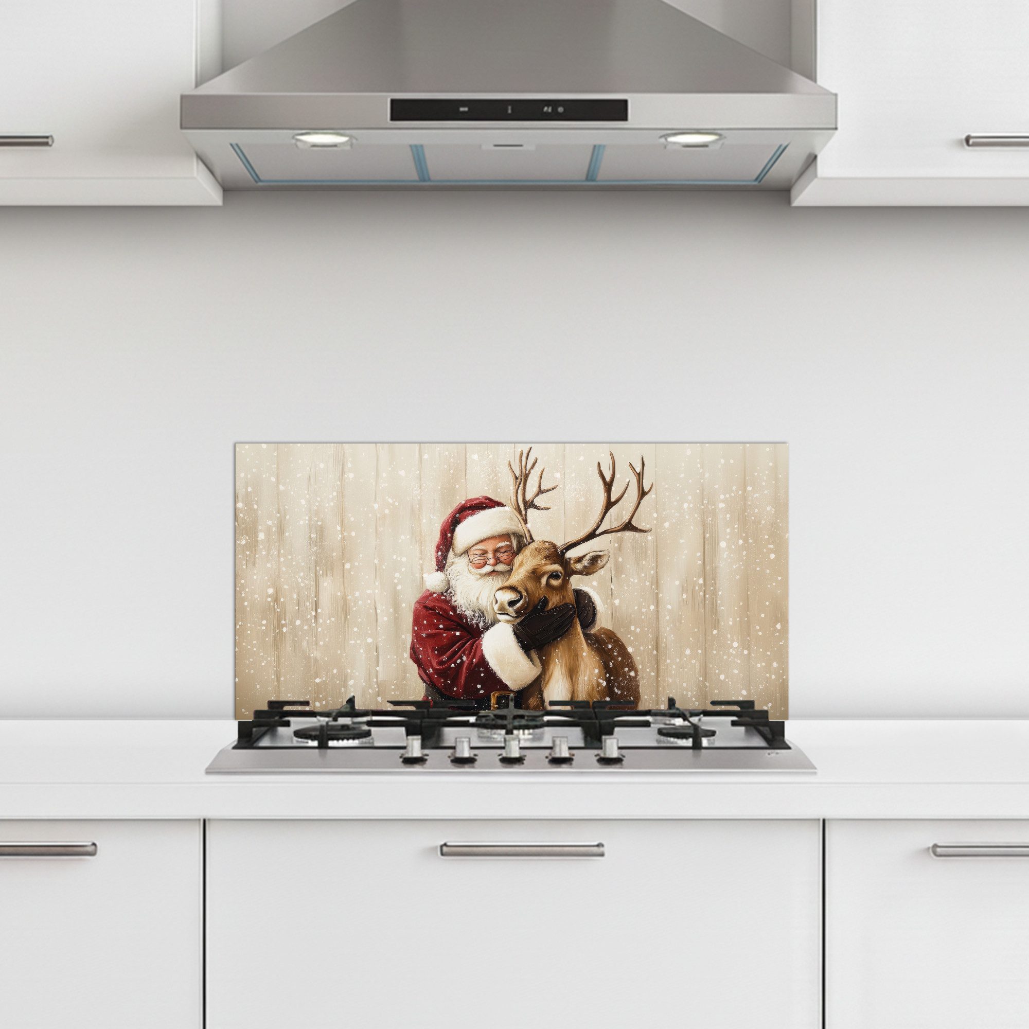 Malerisches Weihnachtsbild vom Weihnachtsmann, der liebevoll ein Rentier umarmt. Beide stehen in einem sanften Schneeregen vor einem hölzernen Hintergrund. Der warme Ausdruck des Weihnachtsmanns und das entspannte Tier vermitteln ein Gefühl von Zärtlichkeit und weihnachtlicher Wärme.