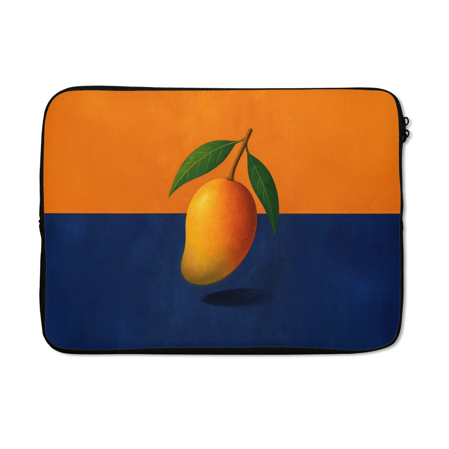 Eine reife Mango mit grünen Blättern schwebt in der Mitte über einem zweifarbigen Hintergrund: oben orange, unten dunkelblau. Der Schatten suggeriert Tiefe.