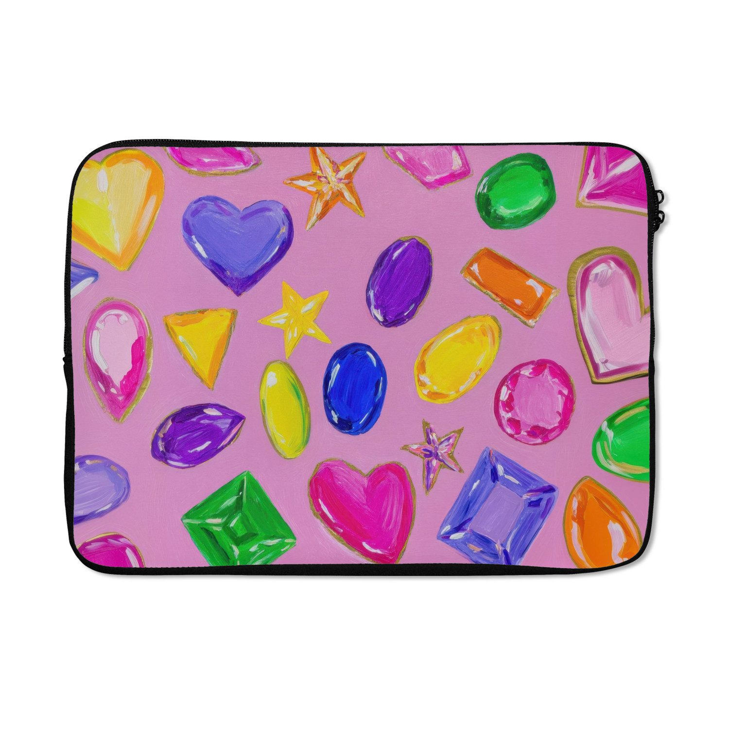 Verschiedene Formen von Edelsteinen in leuchtenden Farben sind auf einem rosa Hintergrund verstreut. Herz-, Stern- und ovale Formen sorgen für einen verspielten Look.