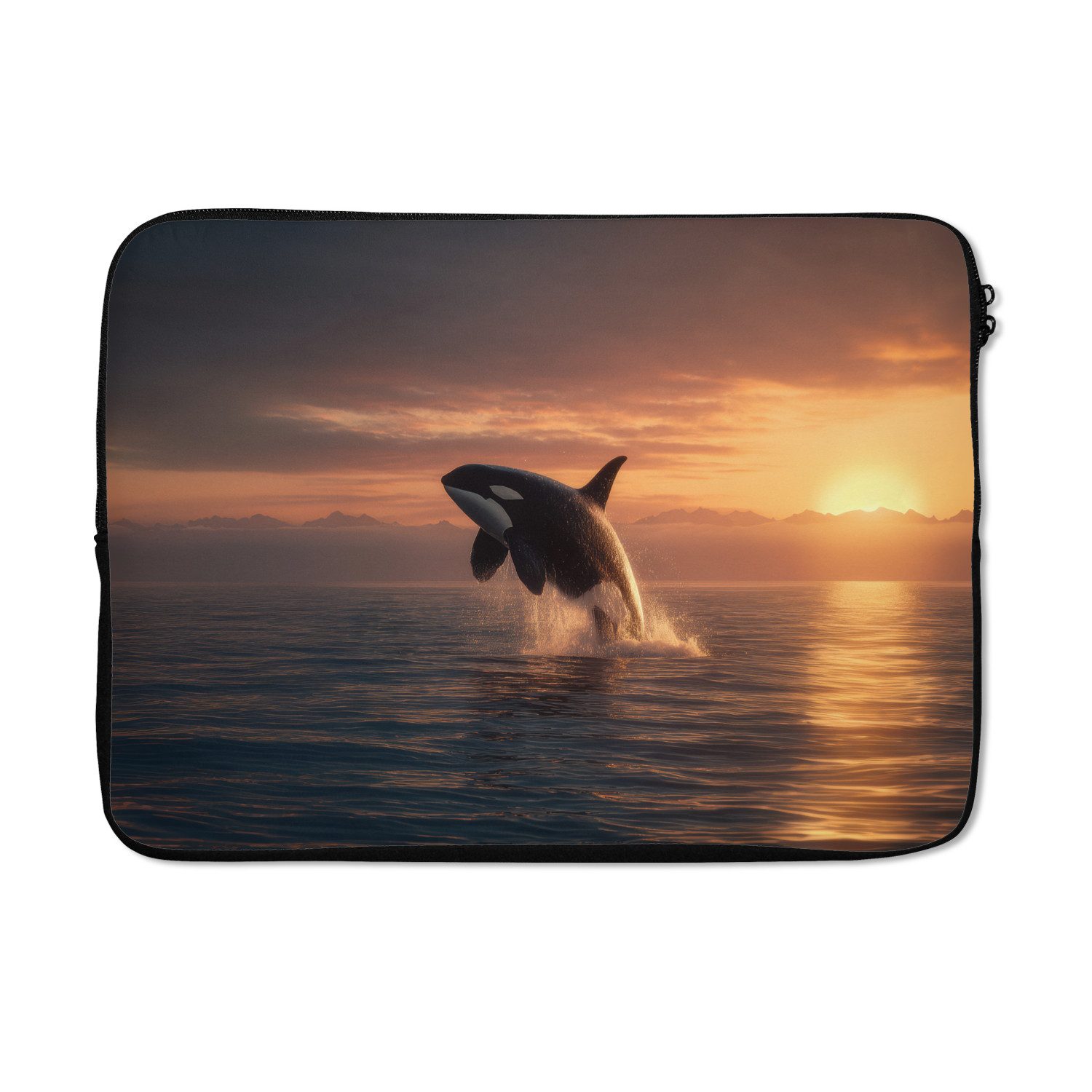 Ein Orca springt aus dem ruhigen Meerwasser, während die Sonne langsam untergeht. Der Horizont leuchtet orange und spiegelt sich in den Wellen.