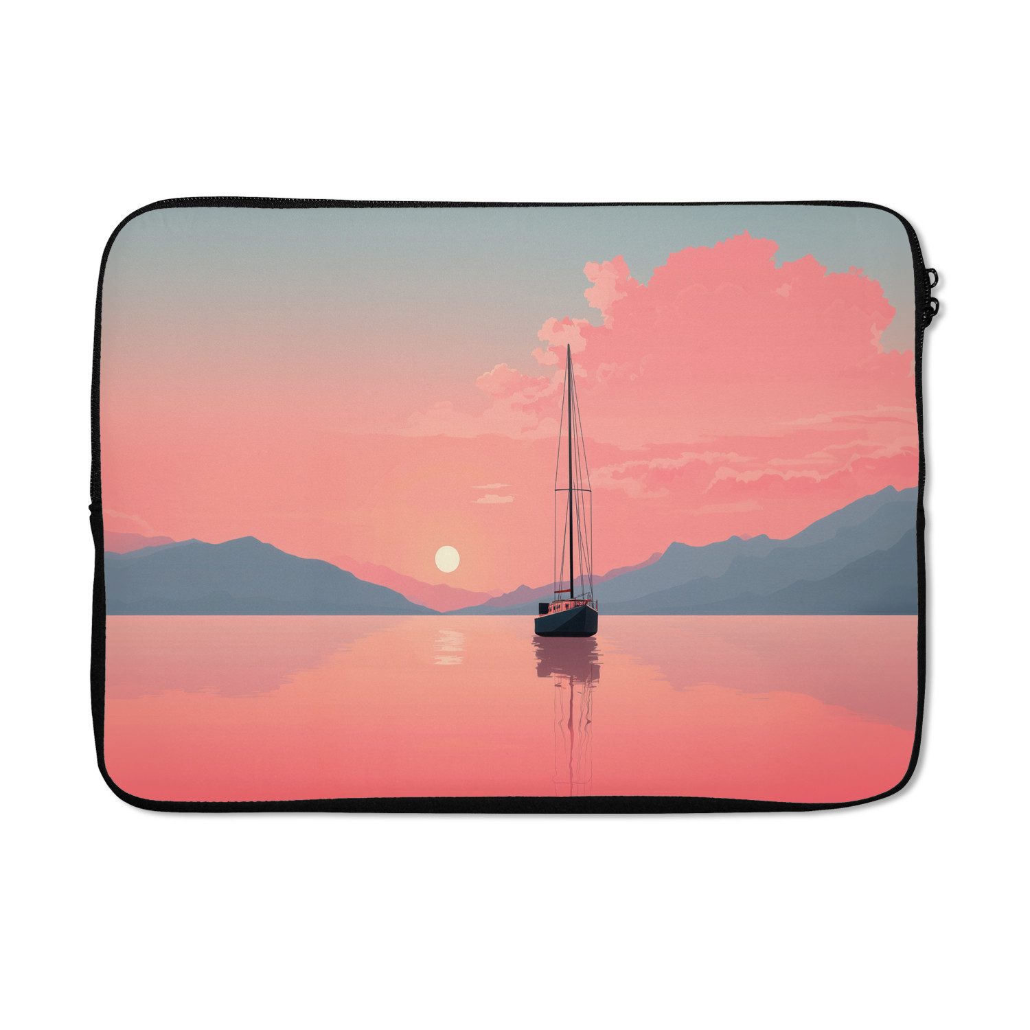 Ein Segelboot schwimmt auf dem spiegelglatten, rosafarbenen Meer, die Sonne steht tief am Horizont und die Berge in der Ferne sind zu sehen. Der Himmel färbt sich in Orangetönen und sanftem Blau.