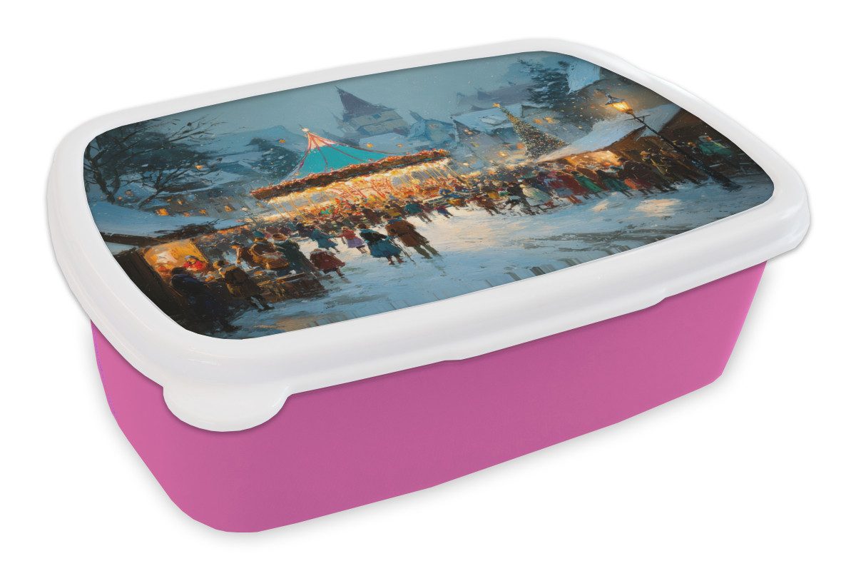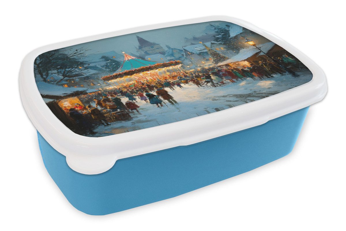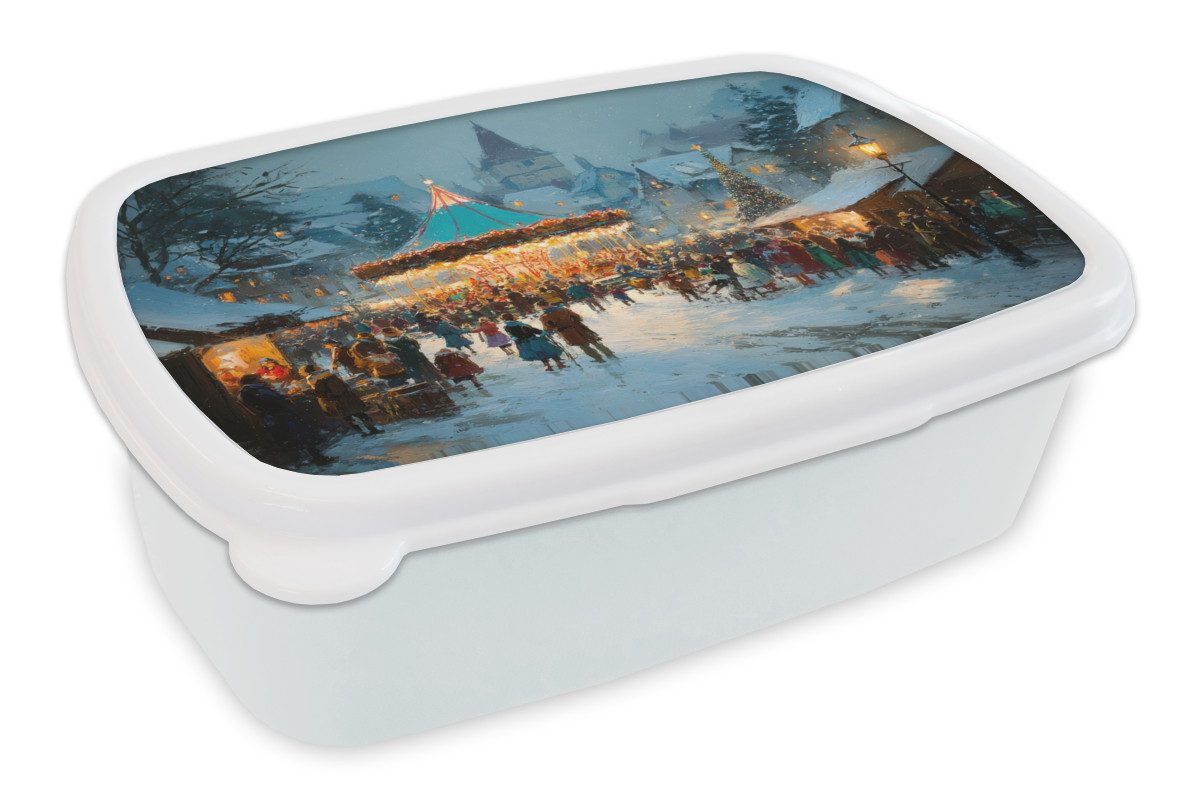Ein lebendiger Weihnachtsmarkt mit beleuchtetem Karussell steht im Mittelpunkt eines verschneiten Dorfplatzes. Menschen schlendern an Ständen vorbei, Kinder spielen und ein großer Weihnachtsbaum erstrahlt im Lichterglanz. Schneeflocken wirbeln herab, während die umliegenden Häuser und der Kirchturm eine warme, festliche Atmosphäre ausstrahlen.
