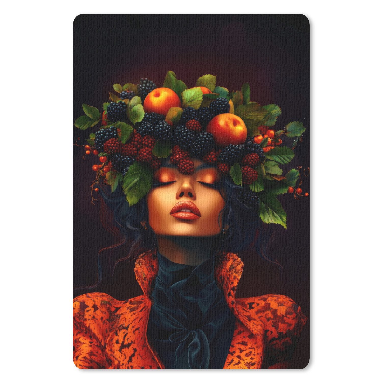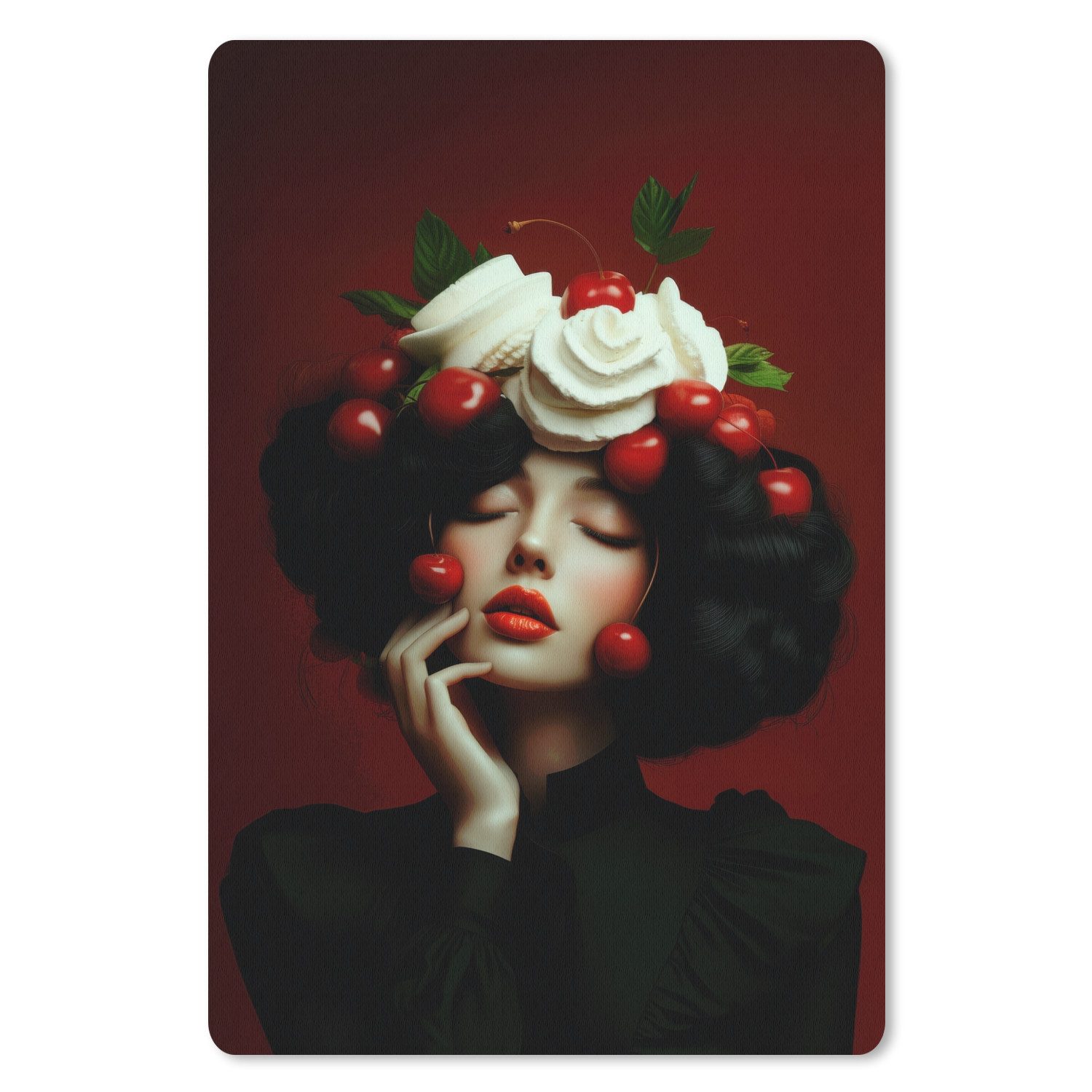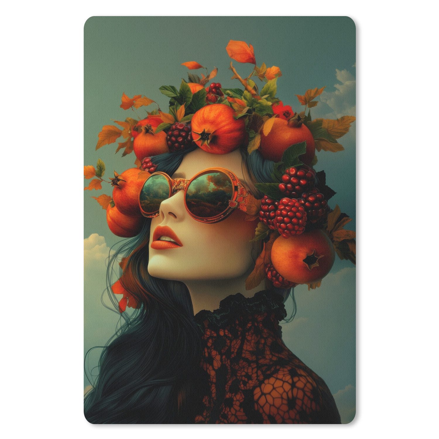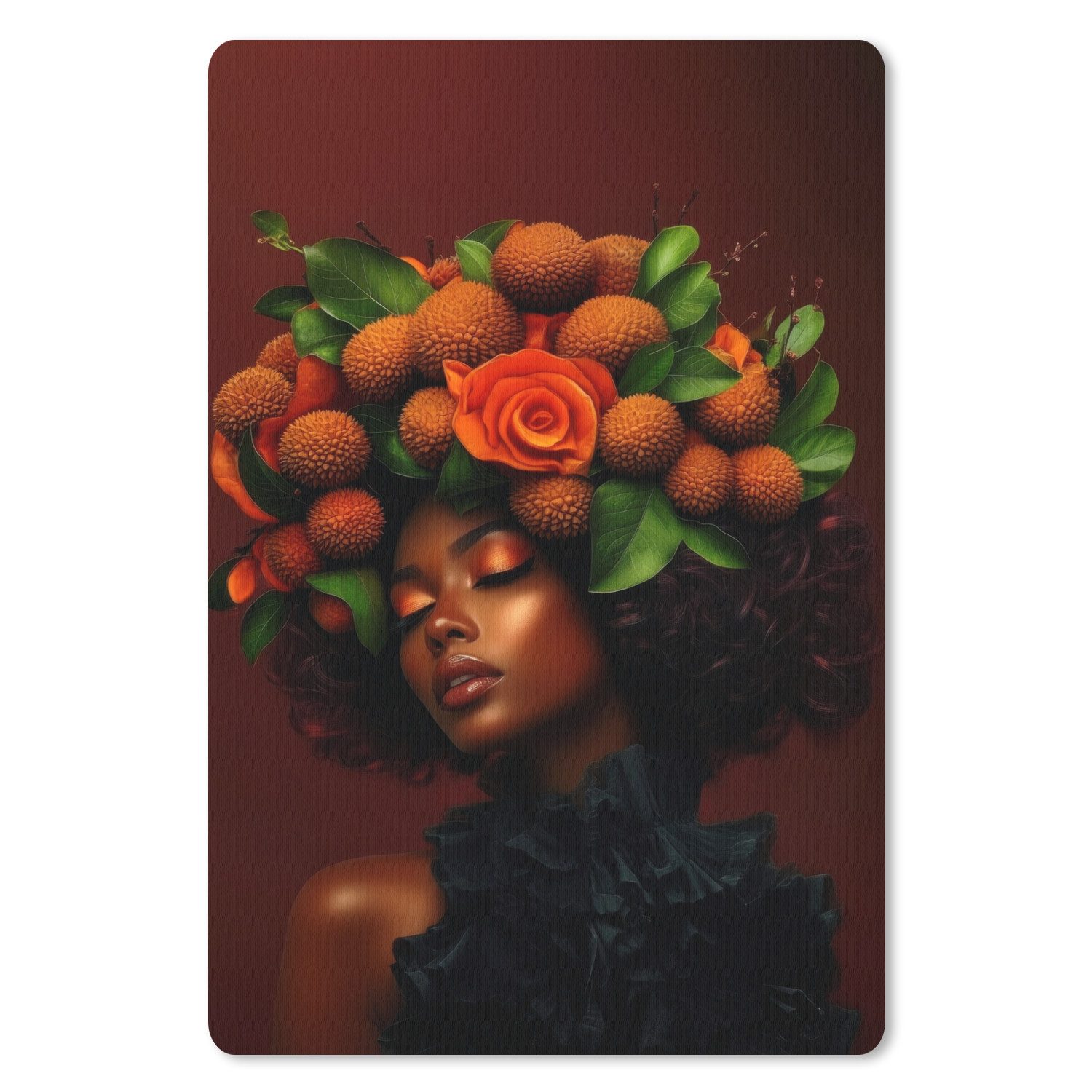Eine Frau trägt einen Kopfschmuck aus bunten Donuts in Rosa, Braun und Orange. Die schwebenden Donuts um sie herum schaffen eine verspielte und surreale Atmosphäre.