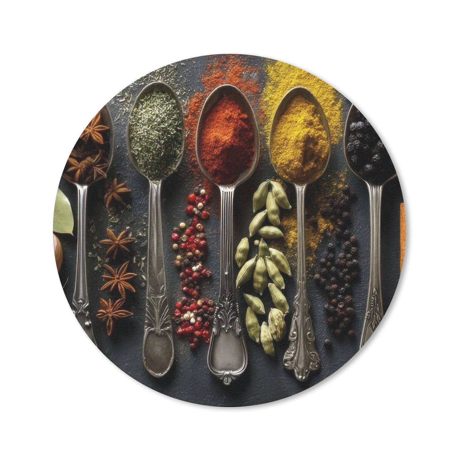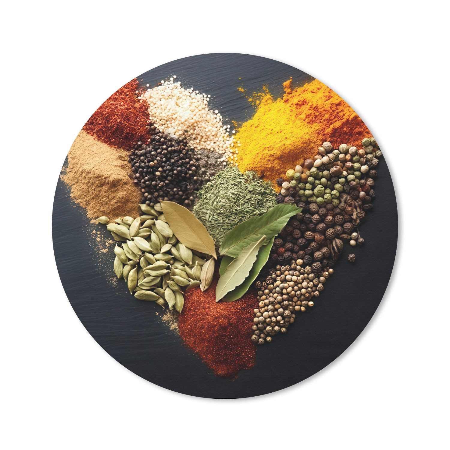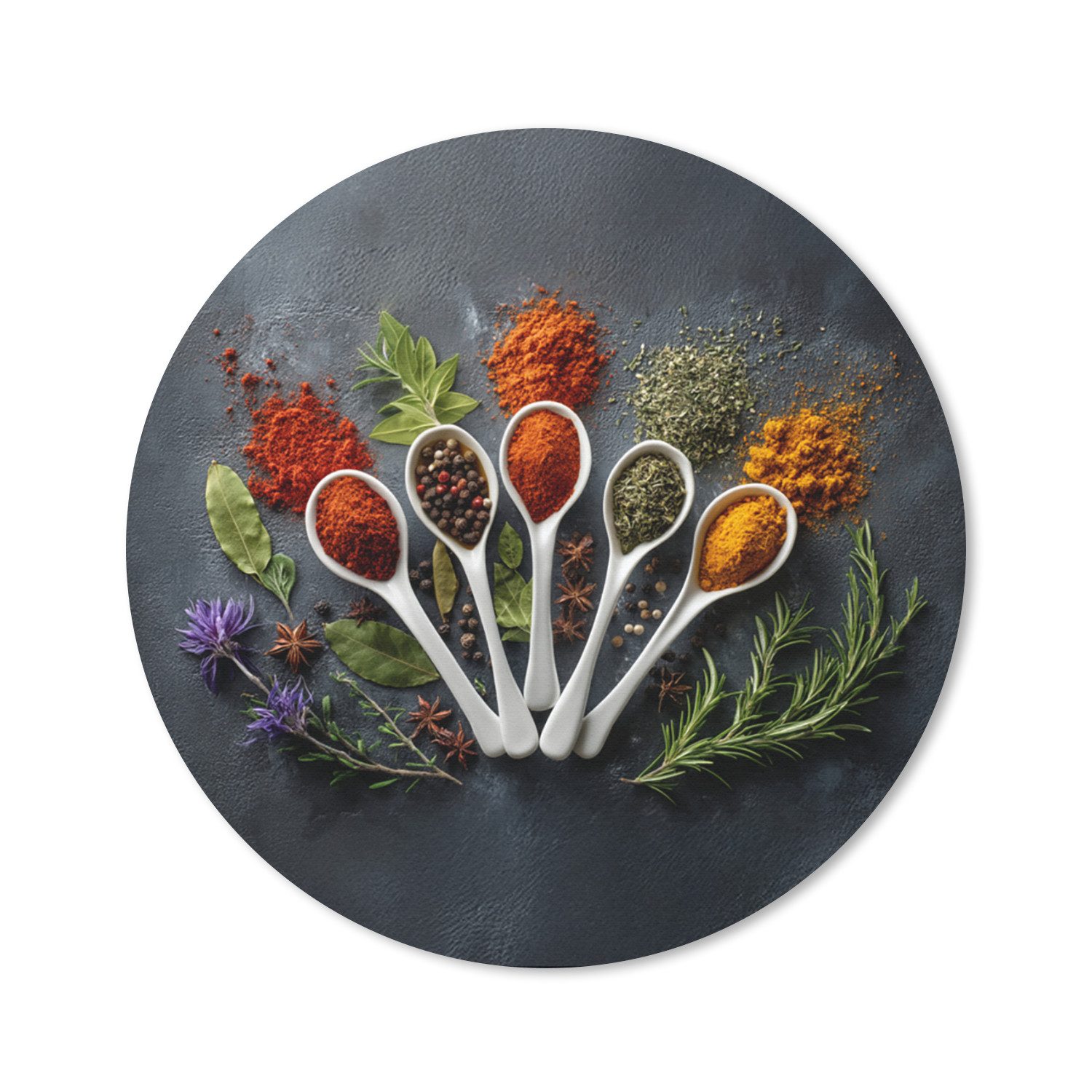 Fünf weiße Löffel, gefüllt mit buntem Kräuterpulver, liegen neben Lorbeer, Rosmarin und Blumen auf dunklem Grund.