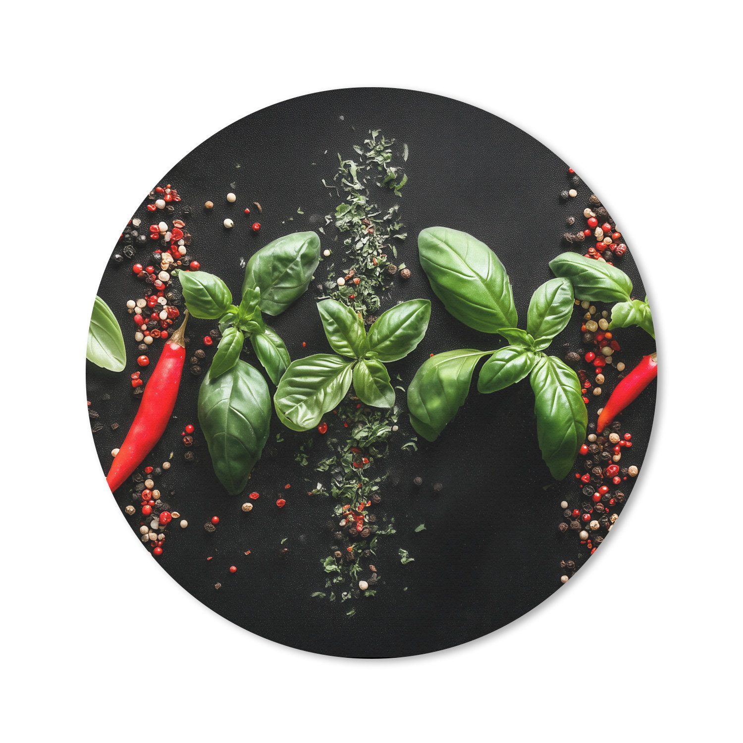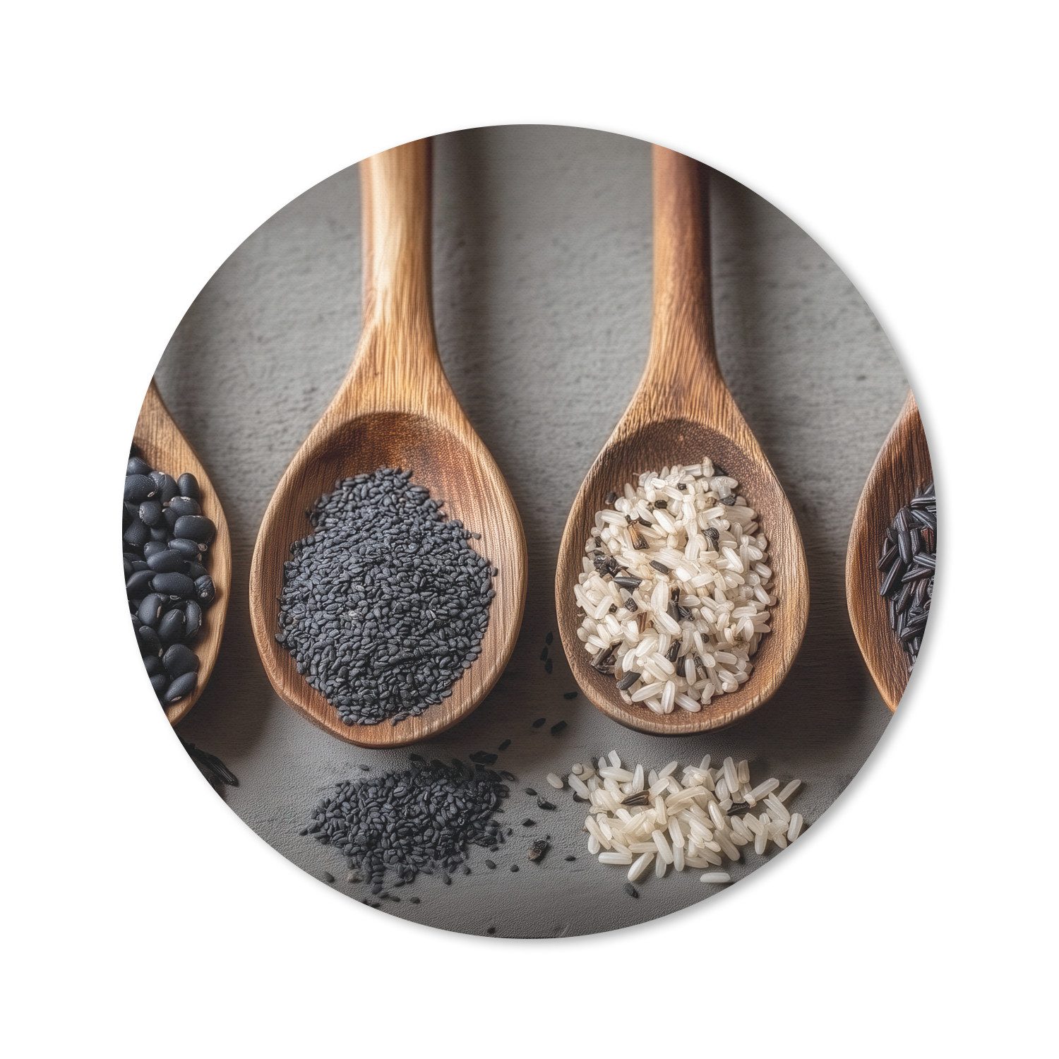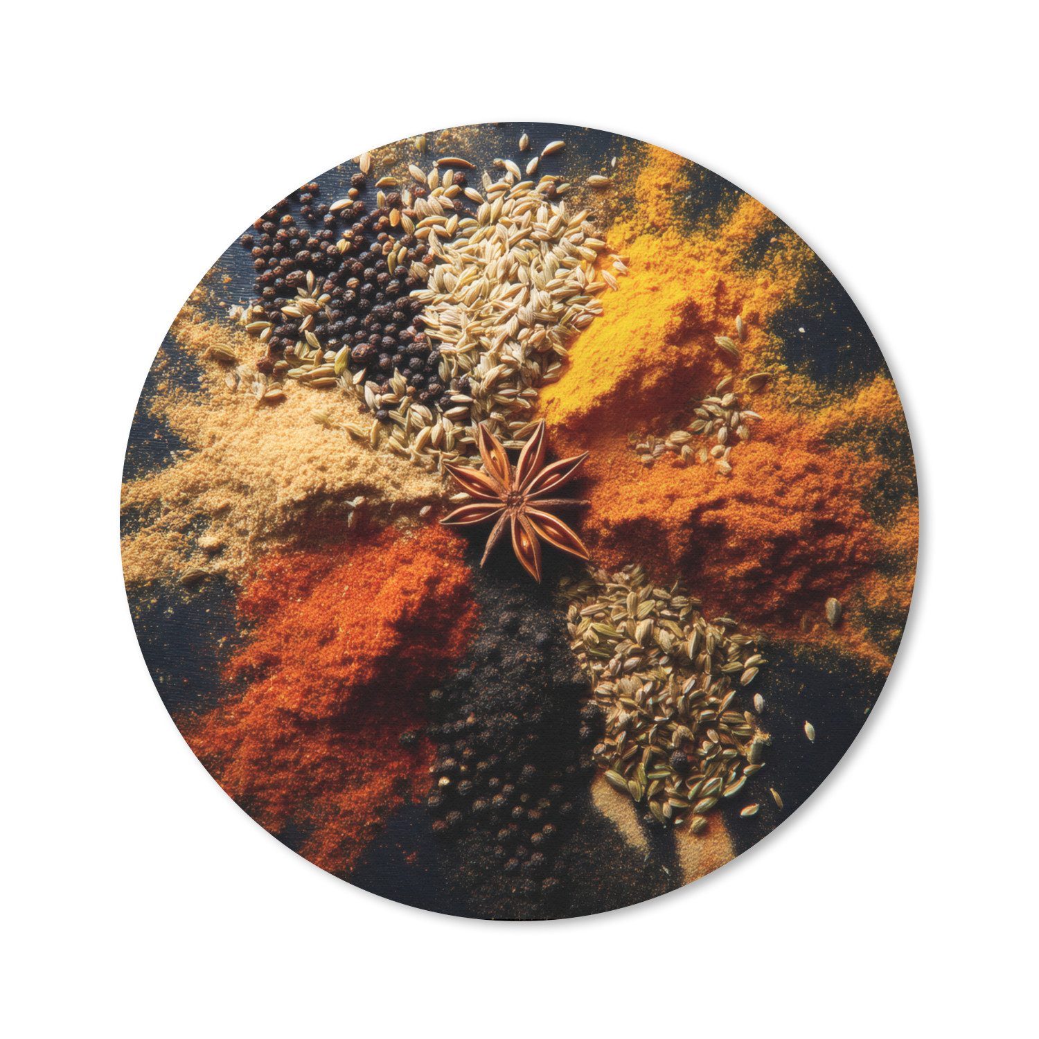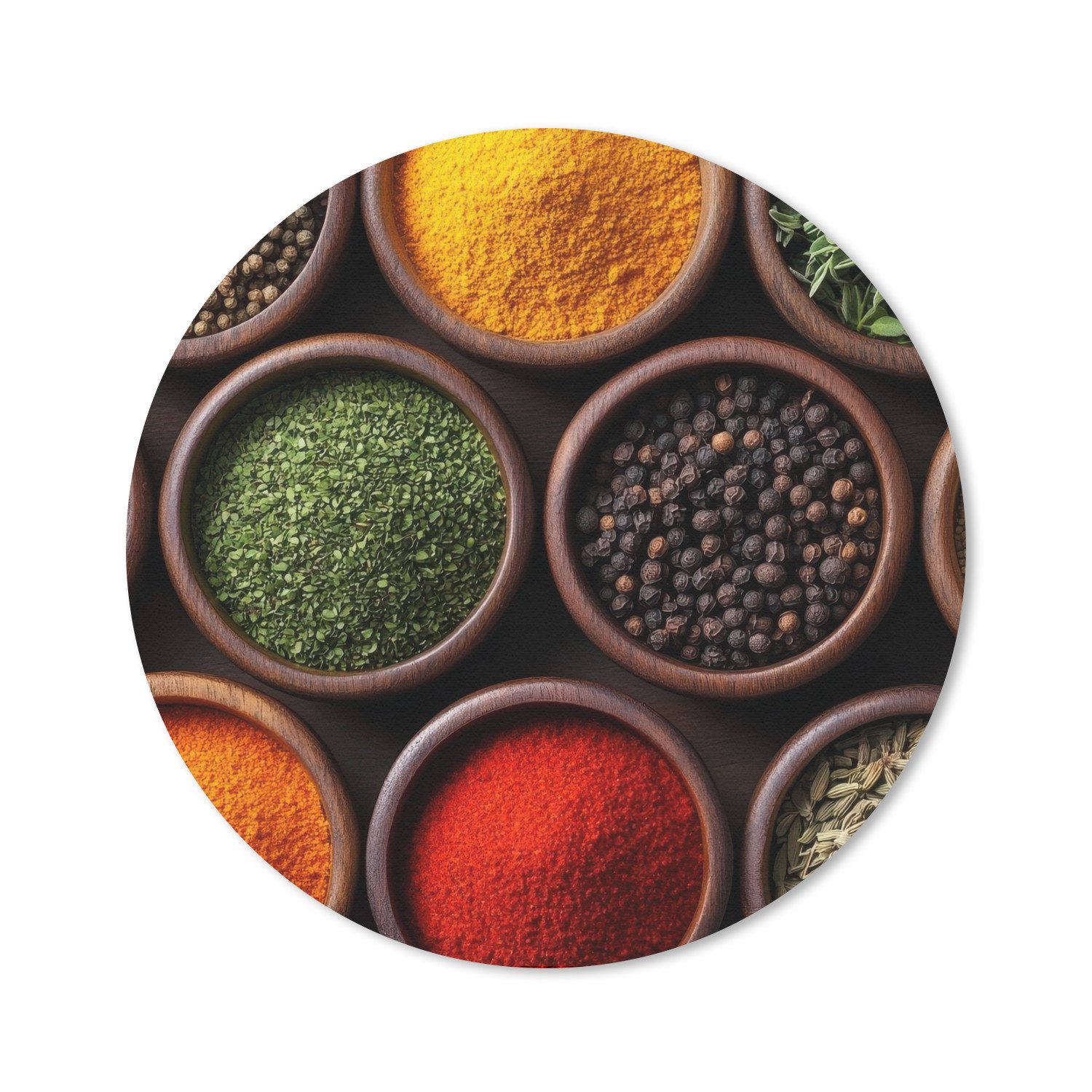 Fünf weiße Löffel, gefüllt mit buntem Kräuterpulver, liegen neben Lorbeer, Rosmarin und Blumen auf dunklem Grund.