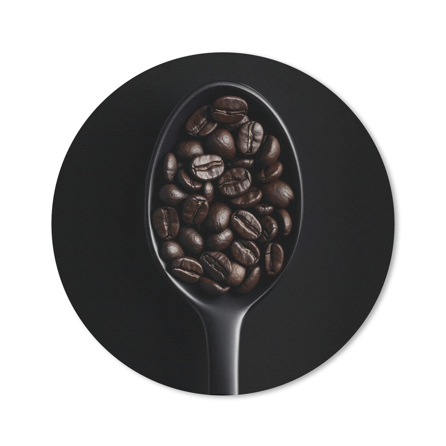 Ein schwarzer Löffel, gefüllt mit glänzenden, dunkel gerösteten Kaffeebohnen vor schwarzem Hintergrund. Die Bohnen haben eine satte, tiefe Farbe und eine glatte Oberfläche, die ihre Frische unterstreicht.