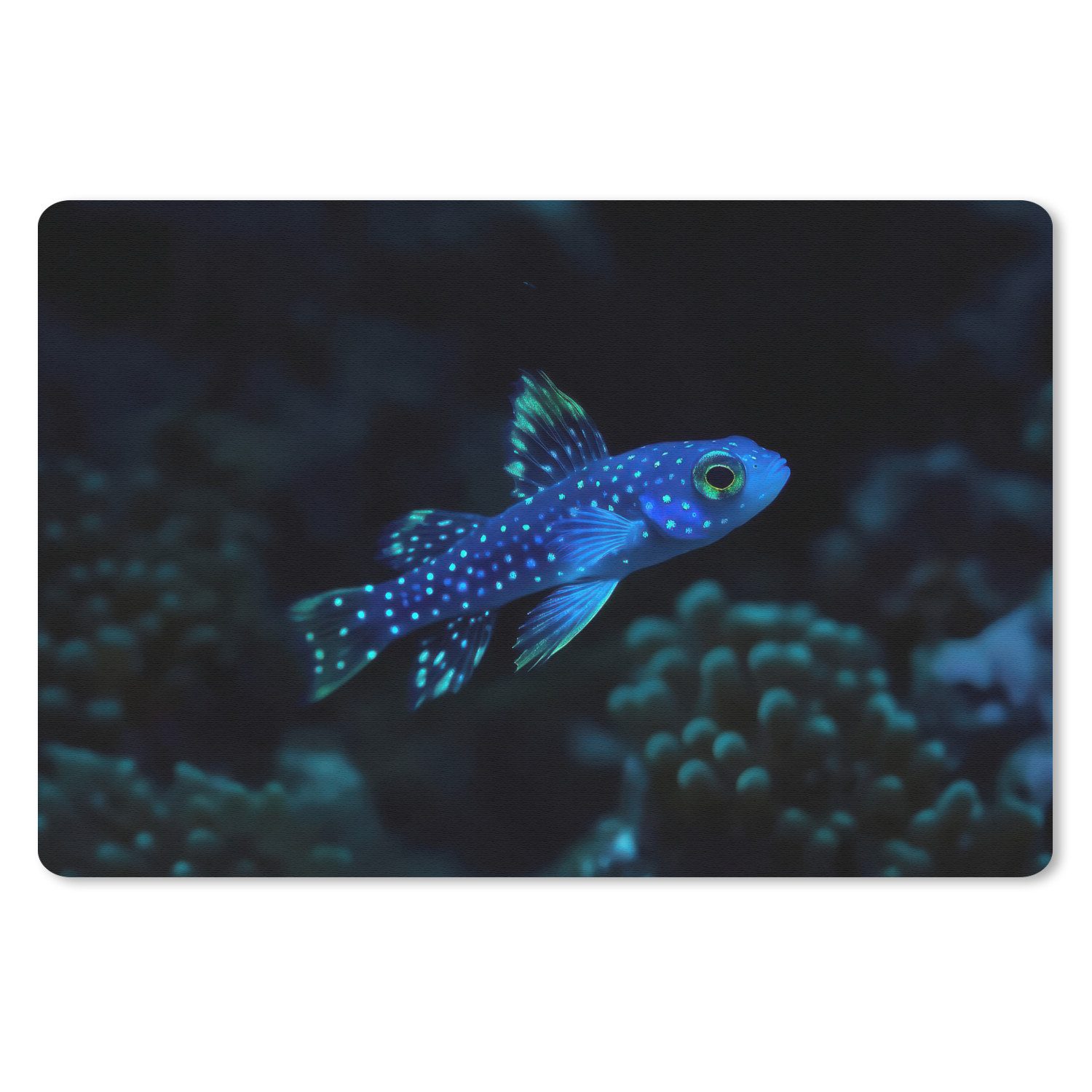 Ein kleiner blauer Fisch mit gelben und türkisfarbenen Punkten schwimmt über Korallen, fotografiert in einer dunklen, blauen Unterwasserumgebung.
