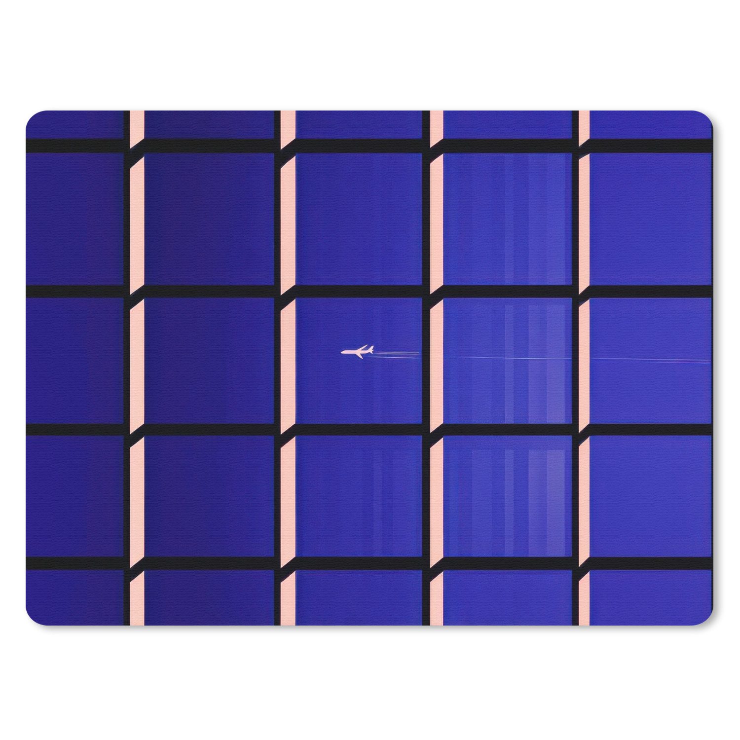 Ein kleines Flugzeug fliegt an den spiegelnden Fenstern einer hohen, blau getönten Glasfassade vorbei, die symmetrisch in rechteckige Flächen unterteilt ist.