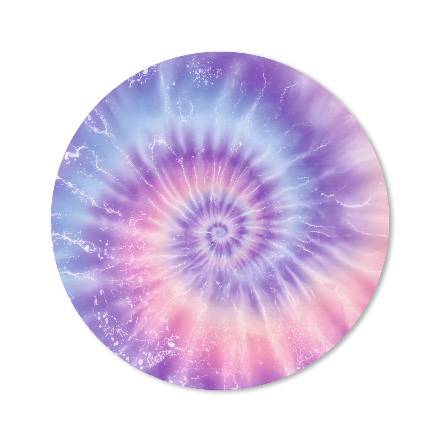 Klassische Tie-Dye-Spirale in sanften Pastelltönen. In der Mitte beginnt die Spirale mit blassem Rosa und geht zu den Rändern hin in blasses Gelb, sanftes Blau, Lavendelviolett und rosa Töne über. Die Textur hat einen bürstenartigen Effekt, der ihr ein weiches, fast wolkenartiges Aussehen verleiht. Die Farben fließen subtil ineinander und schaffen eine verträumte und beruhigende Atmosphäre.