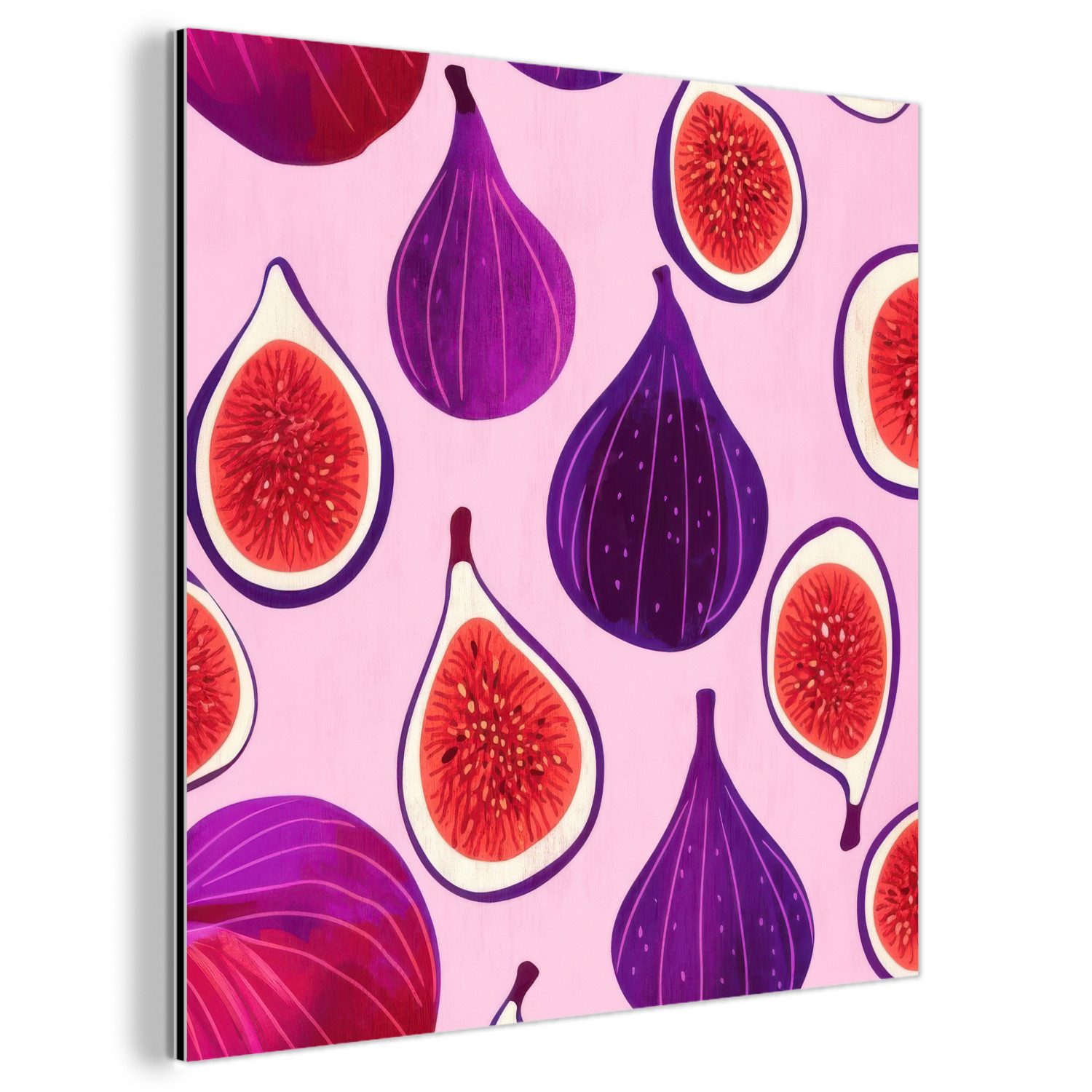 Über das Bild: Mehrere lilafarbene Feigen, sowohl ganze als auch geschnittene, sind über einen rosa Hintergrund verstreut. Die roten Kerne in den Hälften stechen hervor.