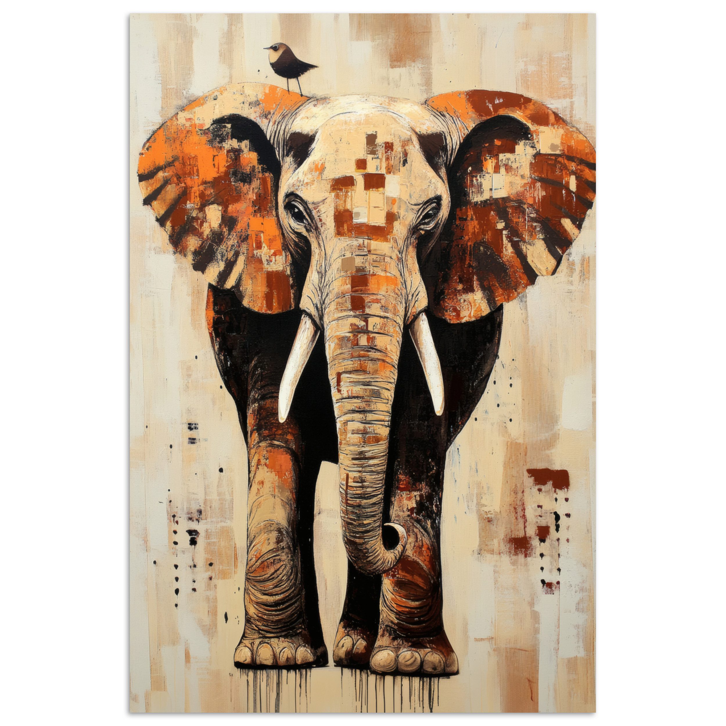 Stilisiertes Bild eines geradeaus blickenden Leoparden, dessen Gesicht symmetrisch in warme Töne aufgeteilt ist. Der Hintergrund ist hell mit streifigen Pinselstrichen, während die Farbe von der Unterseite des Tieres herunterzutropfen scheint.