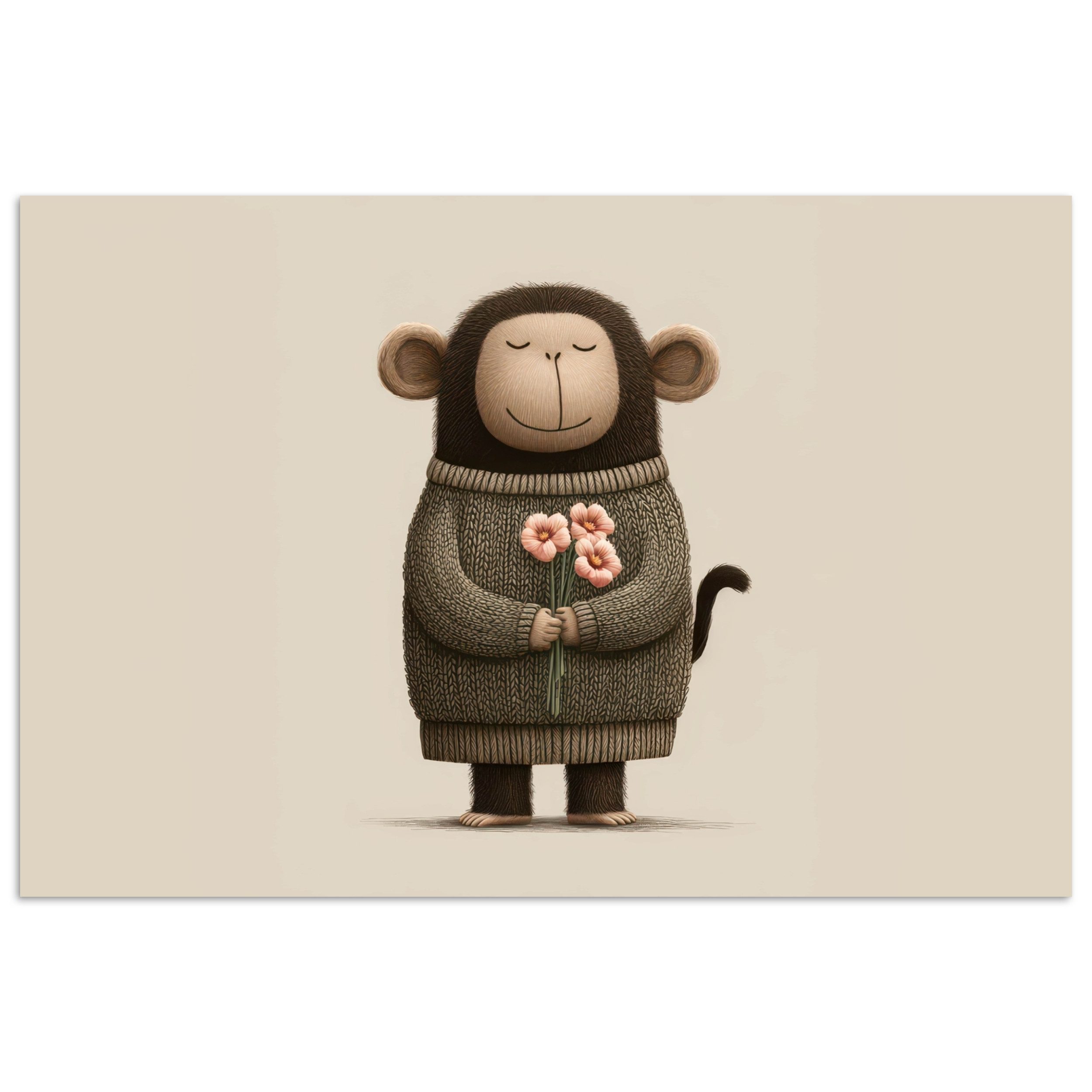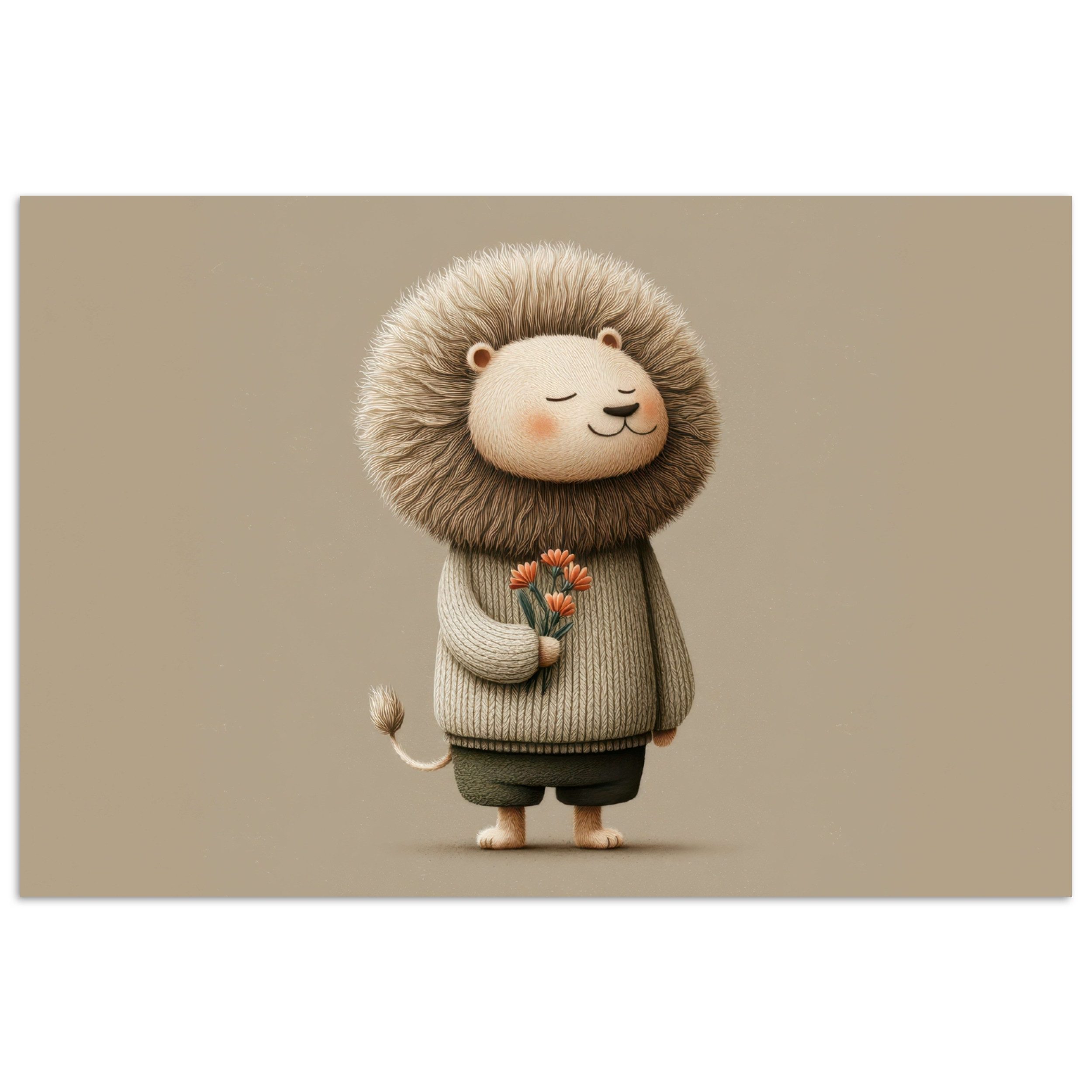 Ein kleiner Löwe mit einer dicken, flauschigen Mähne und einem zufriedenen Lächeln trägt einen beigen Pullover und eine dunkelgrüne Hose. In seiner Pfote hält er ein Paar orangefarbene Blumen. Der Hintergrund ist ein gleichmäßiges Hellbraun und der Stil ist freundlich und minimalistisch.