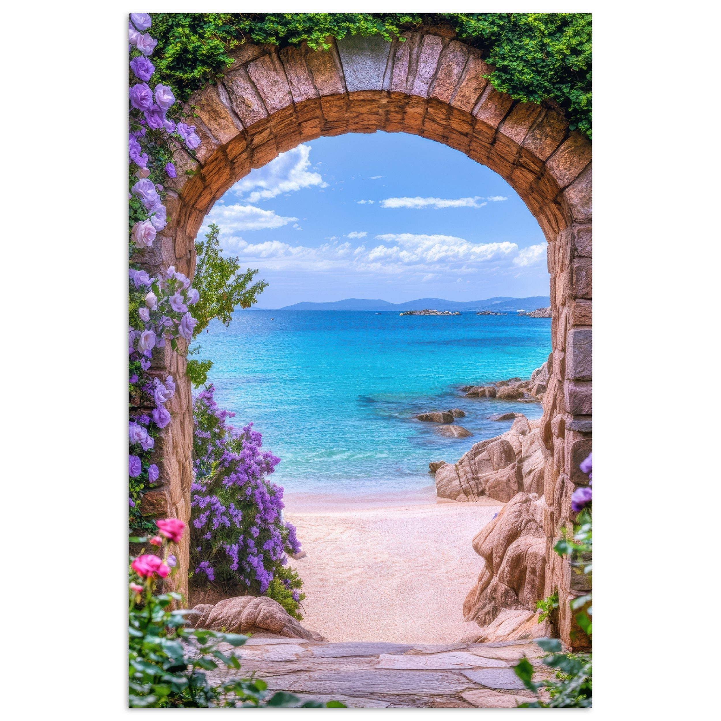 Ein gewundener Steinweg führt durch einen üppigen Garten voller gelber, rosa und violetter Blumen. Ein robuster, mit Kletterrosen und Grünpflanzen geschmückter Steinbogen umrahmt den Eingang zu dieser bezaubernden Oase.