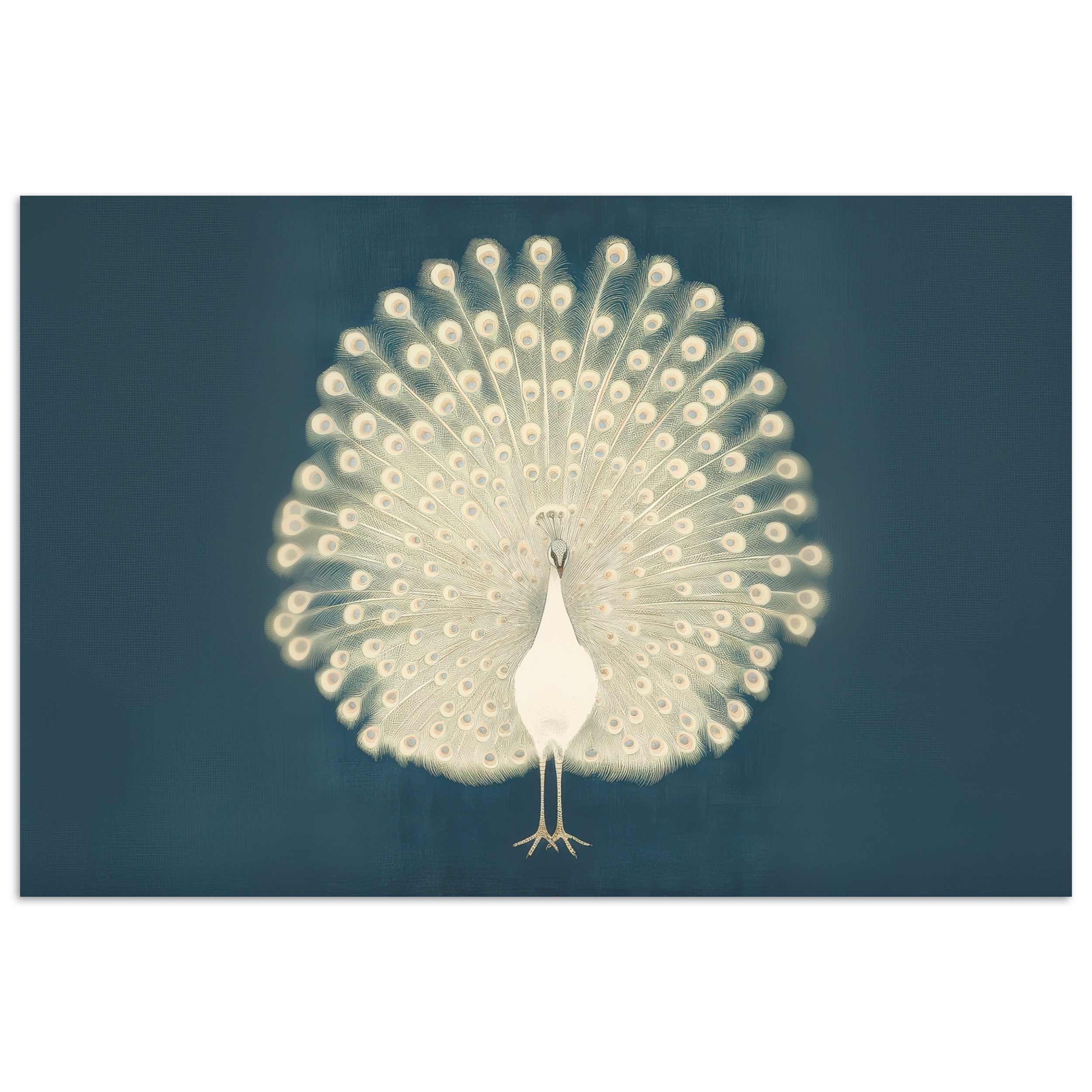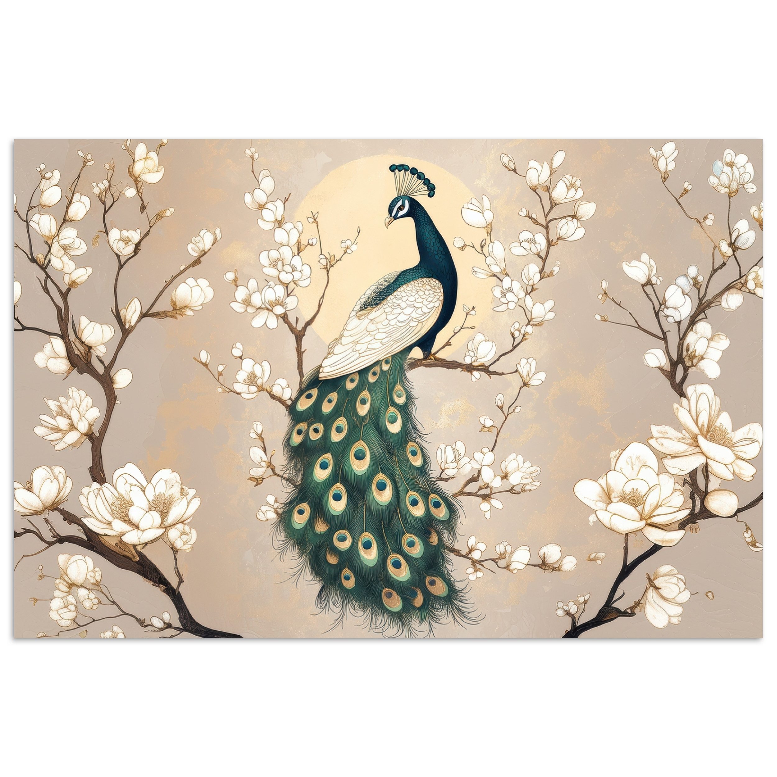 Ein schöner Pfau sitzt auf einem Zweig, umgeben von weißen Blumen. Der Hintergrund ist in sanftem Gold gehalten. Der Pfau hat einen blauen Kopf, weiße Flügel und einen langen grünen Schwanz mit hübschen Mustern.
