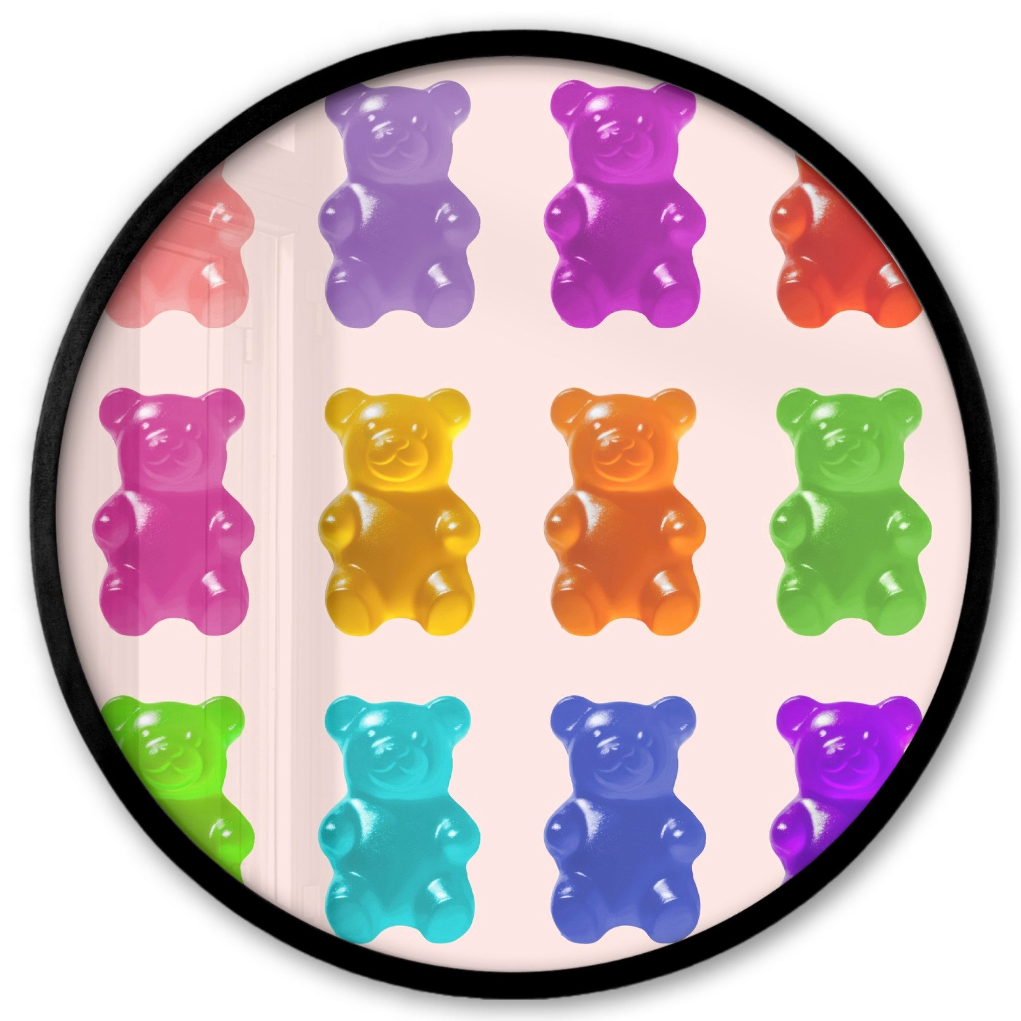 Zwölf farbenfrohe Gummibärchen in einem klaren Gitter auf einem hellen cremefarbenen Hintergrund. Jeder Bär hat einen einzigartigen, leuchtenden Farbton, von rosa und lila bis grün und orange, mit einer glänzenden, durchscheinenden Textur, die ihre Süße hervorhebt.