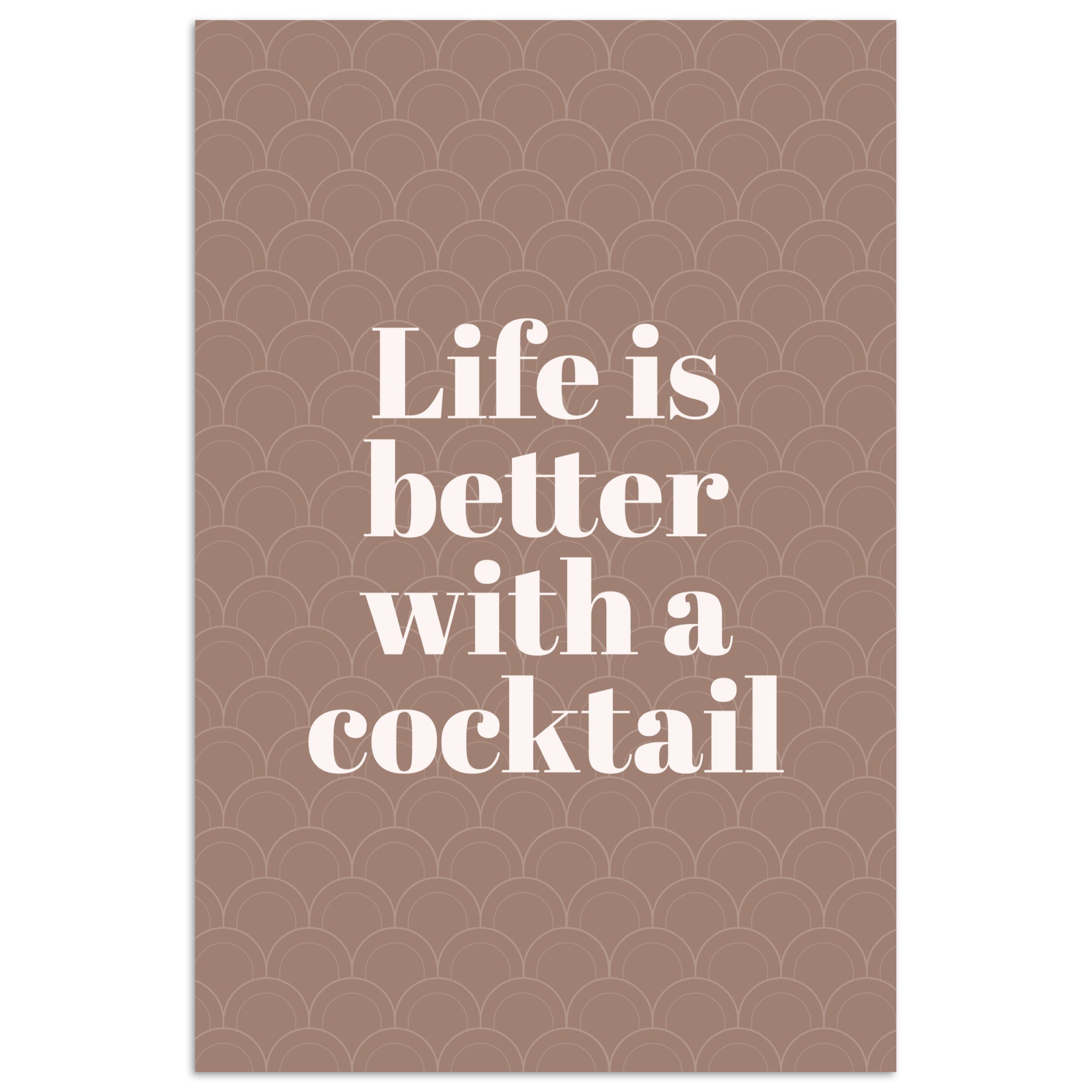 Der Satz "Life is better with a cocktail" steht in weißen Serifenbuchstaben auf einem weichen braunen Muster aus Halbkreisen. Die Stimmung ist stilvoll und leicht verspielt.