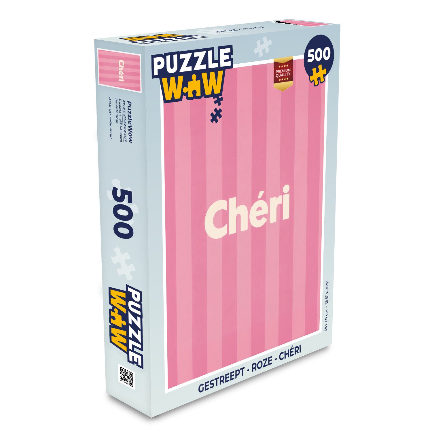 Der Schriftzug "Chéri" ist groß und zentriert auf einem rosa gestreiften Hintergrund. Die weißen Buchstaben heben sich ab und vermitteln ein Gefühl von Zärtlichkeit und Romantik.| Breite | 34 cm |