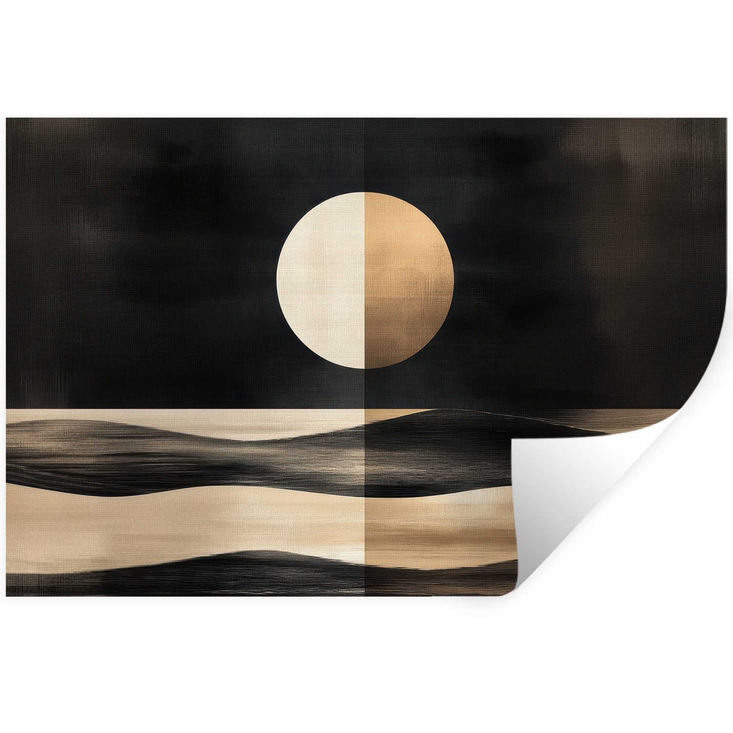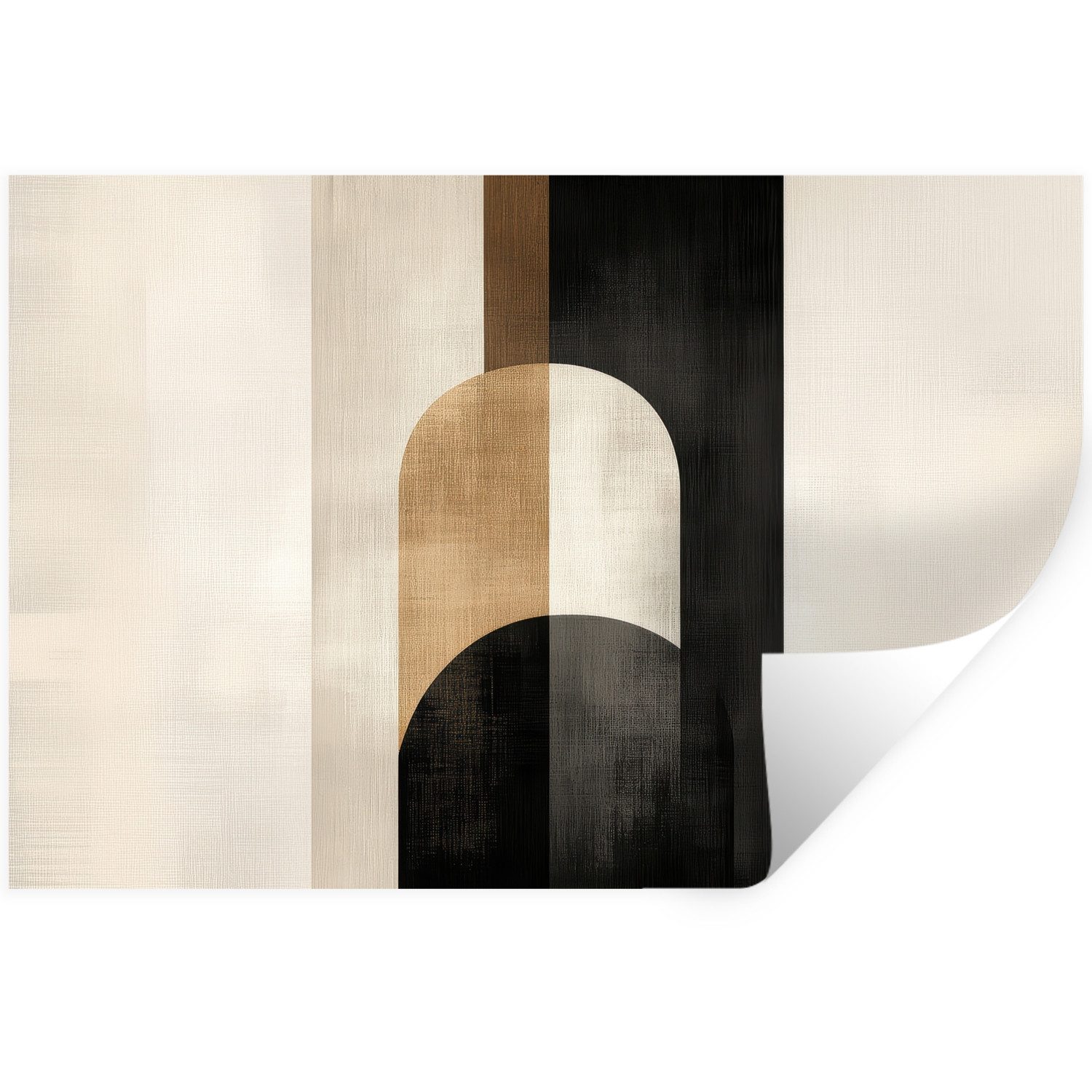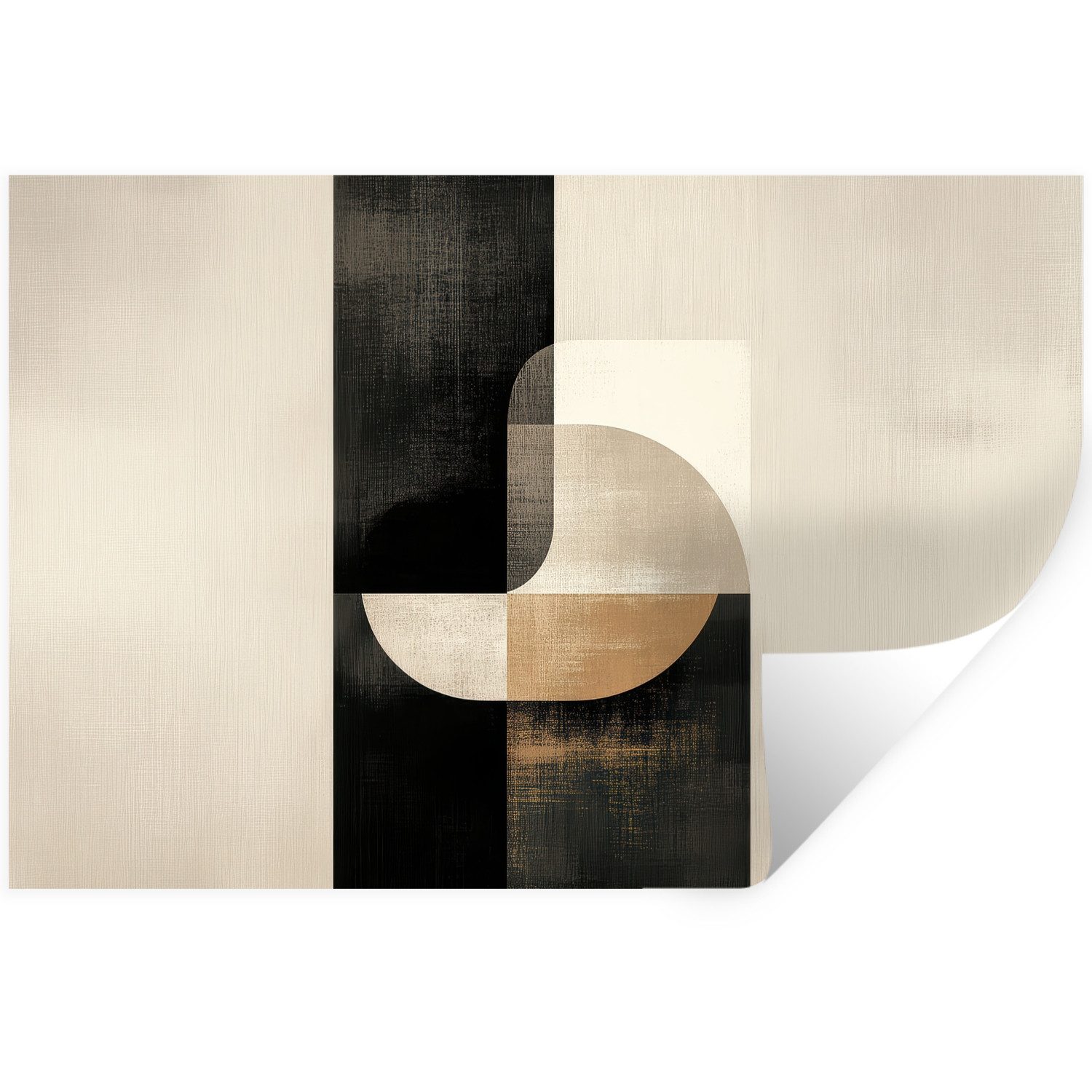 Ein Kunstwerk mit Quadraten und geschwungenen Formen. Die Farben Schwarz, Weiß und Gold schaffen ein schlichtes und modernes Bild.