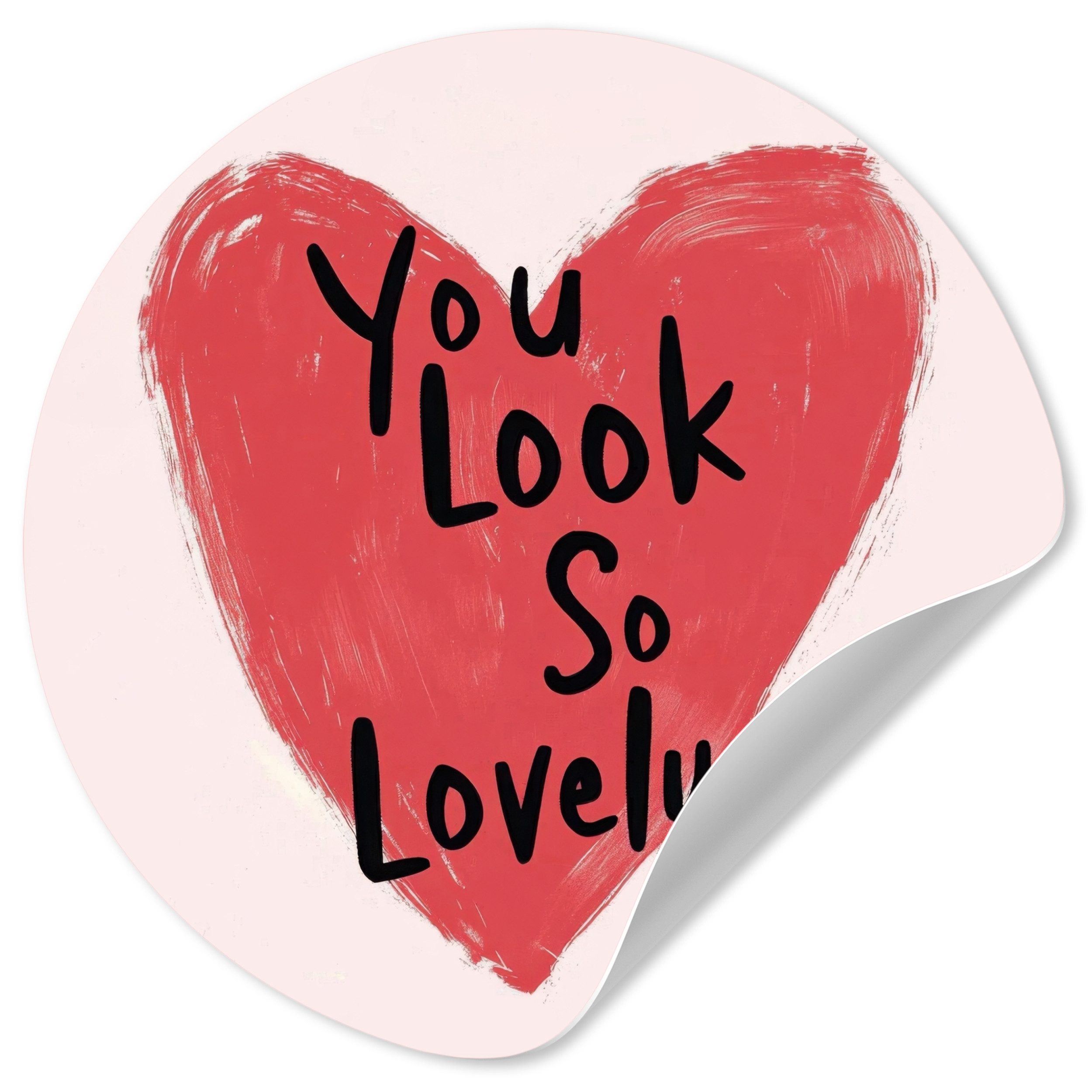 Ein handgemaltes rotes Herz auf einem weichen, beigen Hintergrund mit dem Text "You Look So Lovely" in verspielten schwarzen Buchstaben. Die unvollkommenen Pinselstriche und die Handschrift verleihen dem Design eine warme und persönliche Note voller Komplimente und Charme.