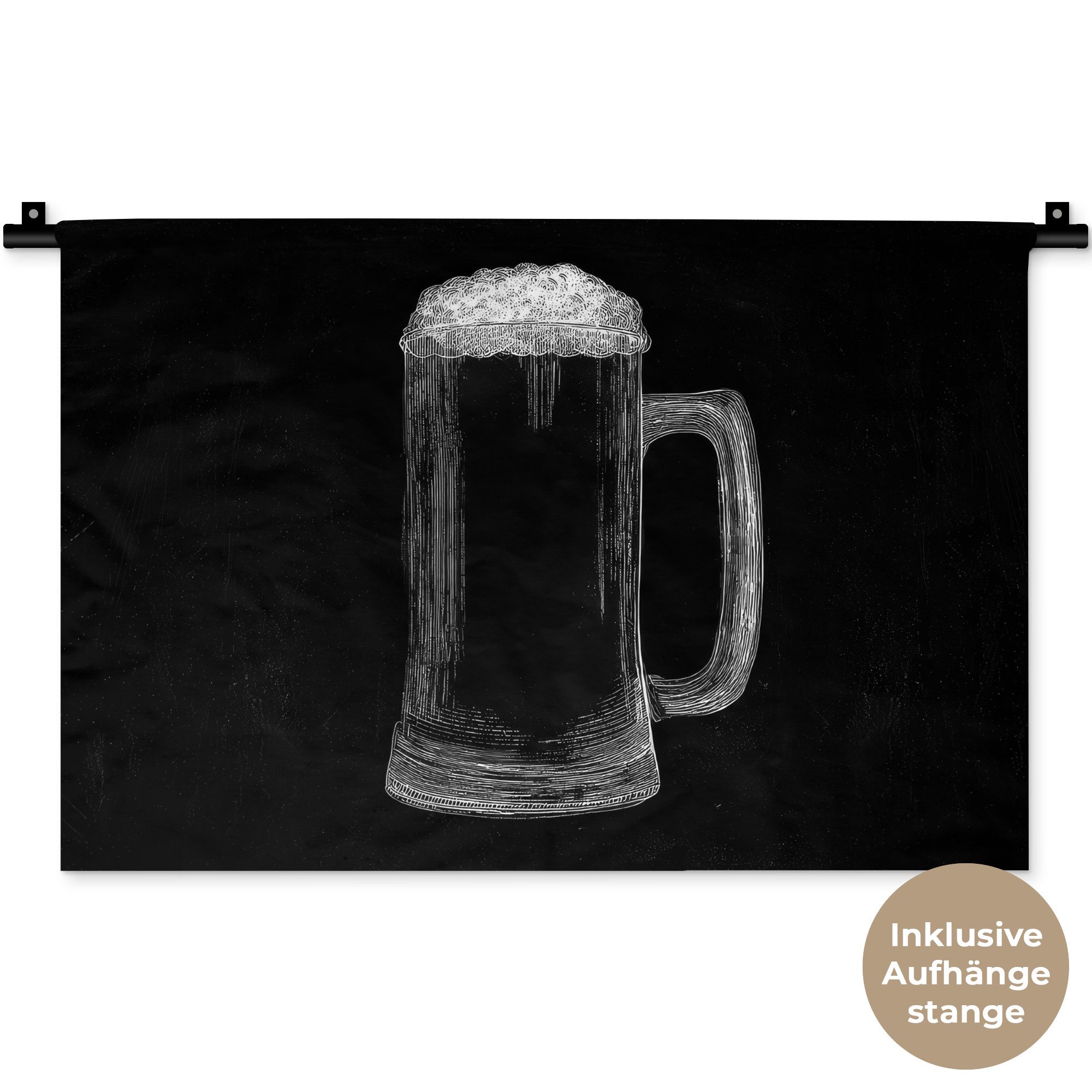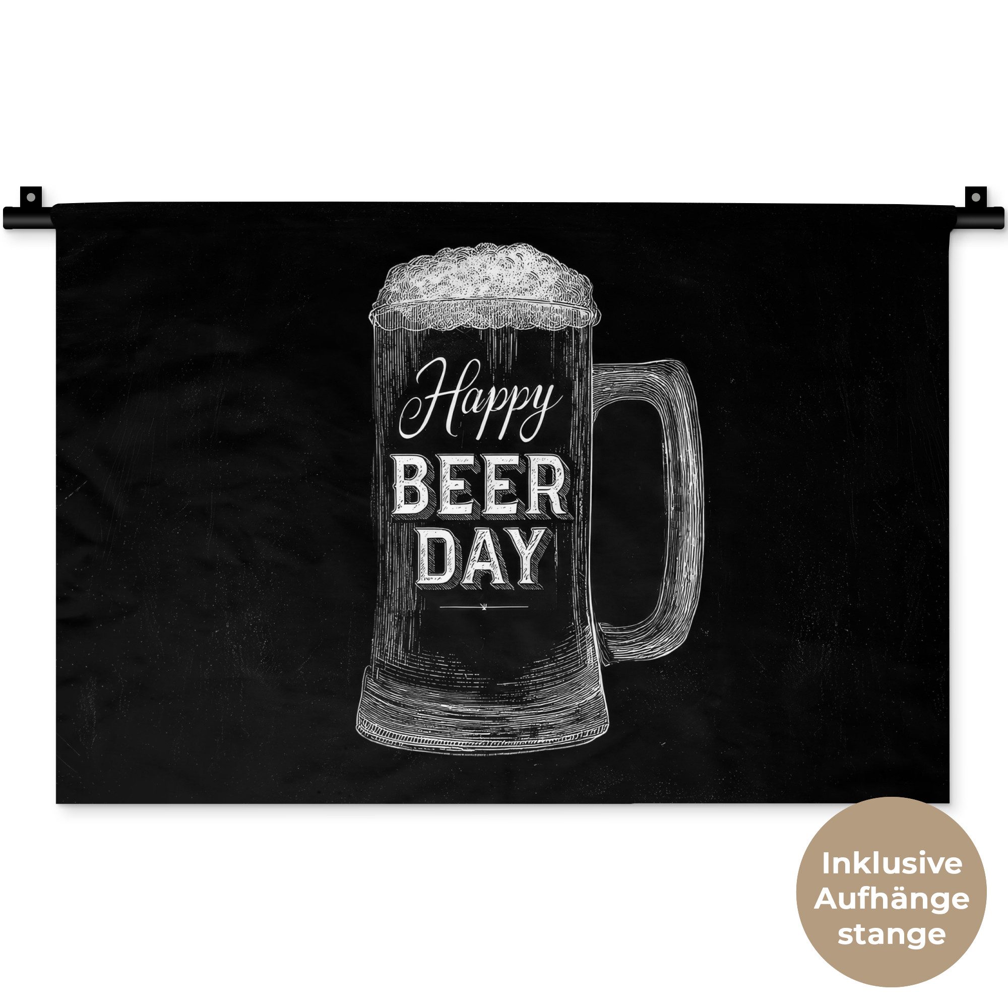 Illustration eines Bierkrugs mit Schaum und dem Text "Happy Beer Day" in weißen Kreidebuchstaben.