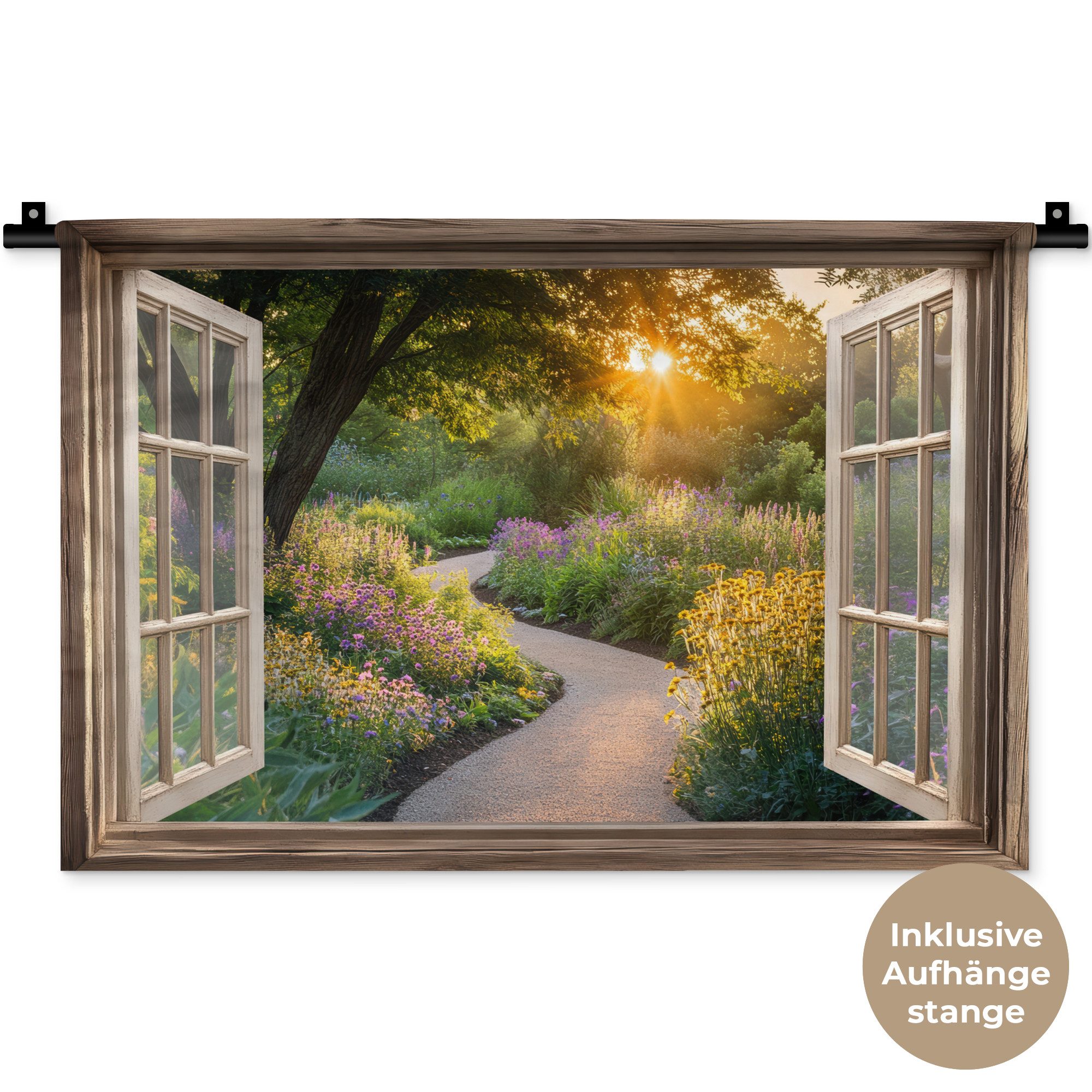Ein gewundener Kiesweg schlängelt sich durch einen Garten voller Wildblumen in lila und gelben Farbtönen. Die tiefstehende Sonne wirft einen goldenen Schein auf die Landschaft, während ein großer, schattenspendender Baum einen Hauch von Ruhe und Gelassenheit verleiht.