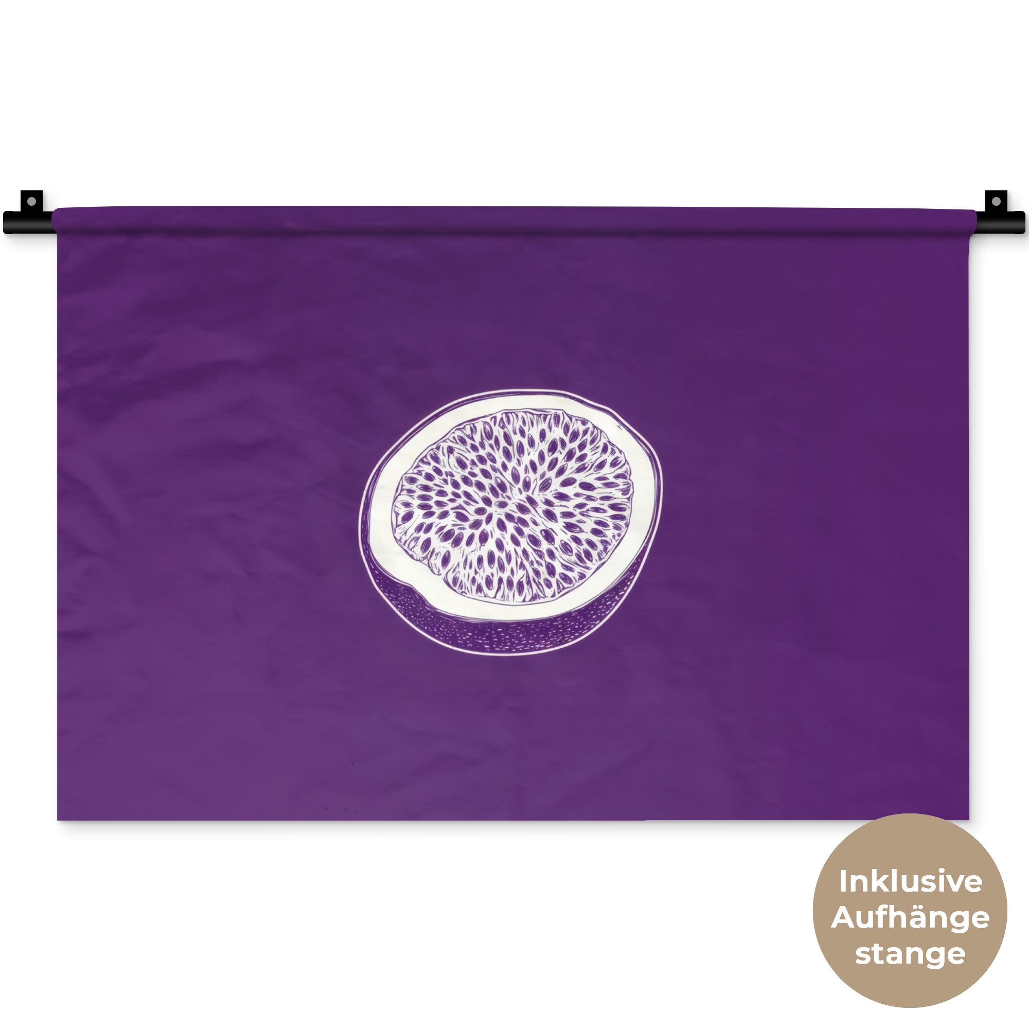 Eine halbe Passionsfrucht, akribisch in Weiß vor einem tiefvioletten Hintergrund gezeichnet, der die komplexe Samenstruktur hervorhebt.