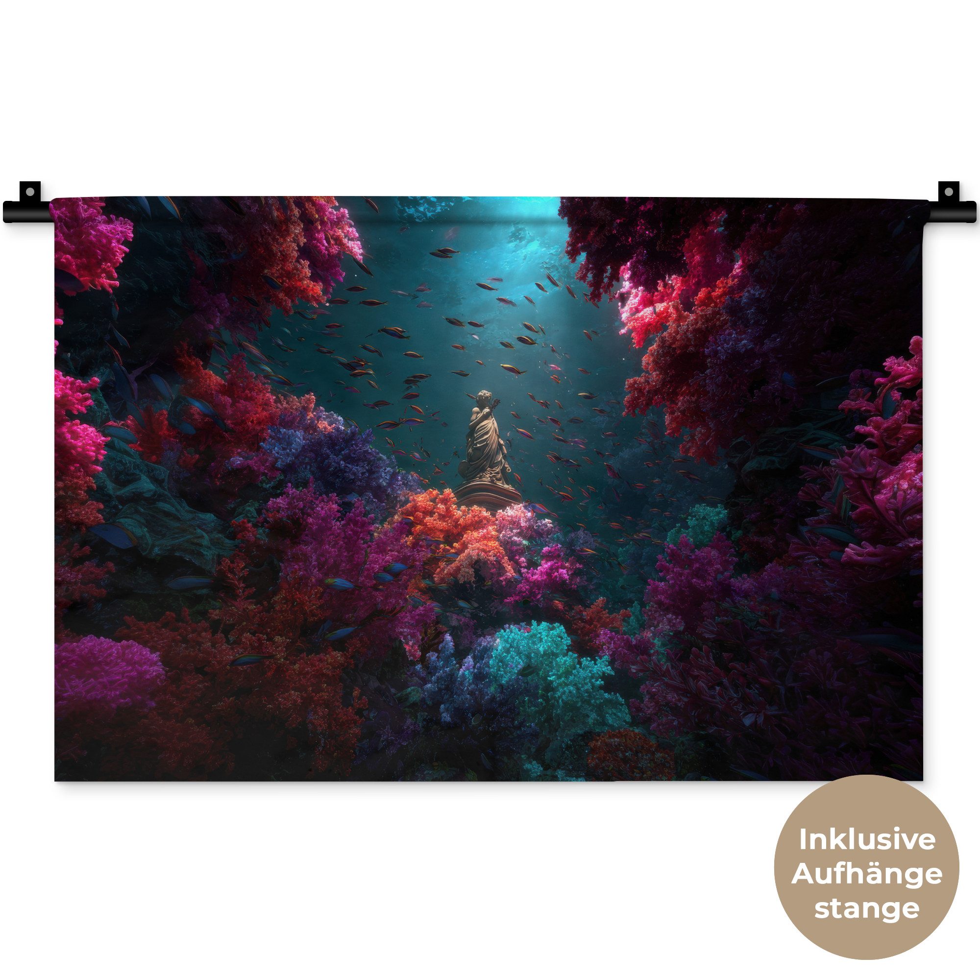 Eine Statue steht auf dem Meeresgrund, umgeben von einer Hecke aus bunten Korallen und einem Fischschwarm, der an ihr vorbeischwimmt.