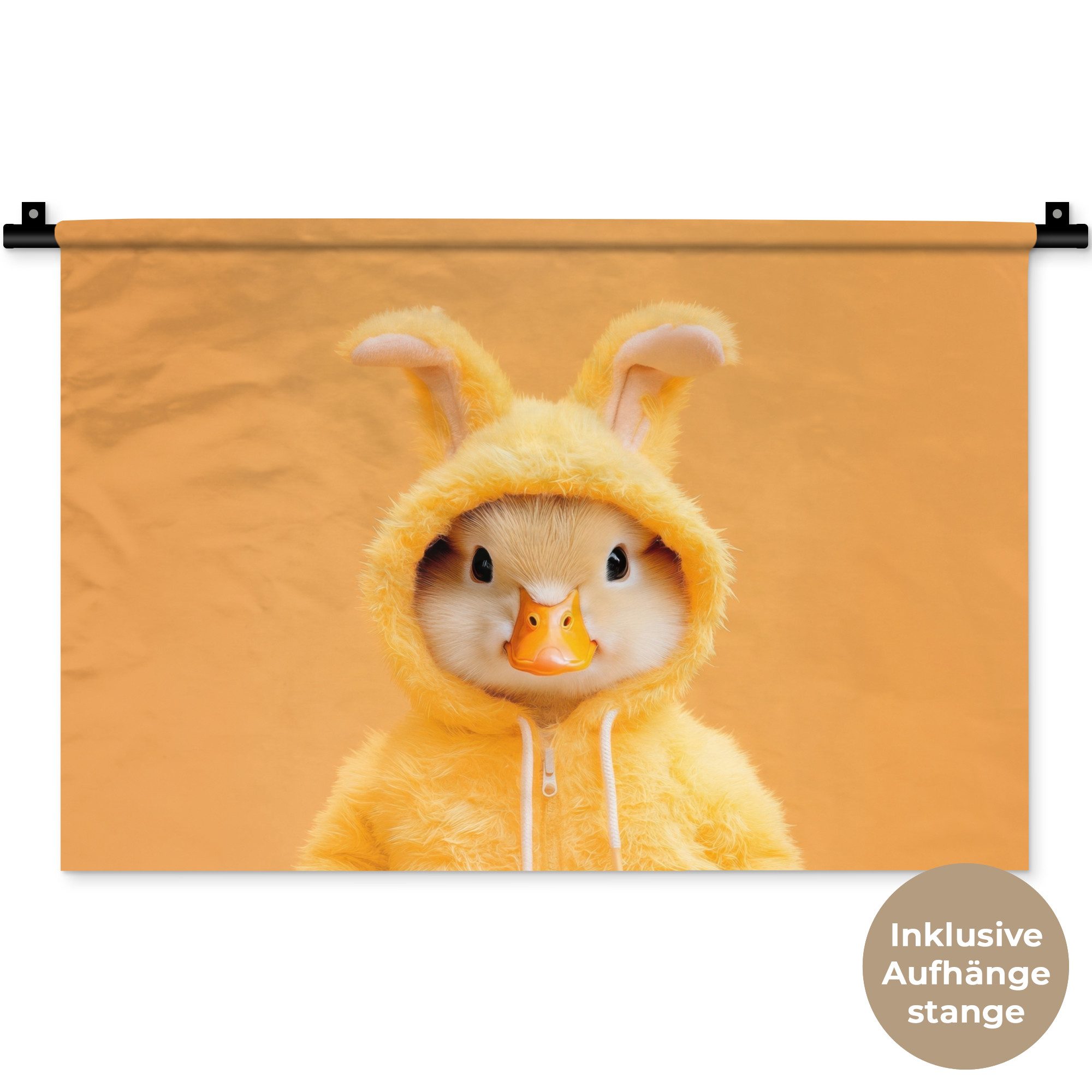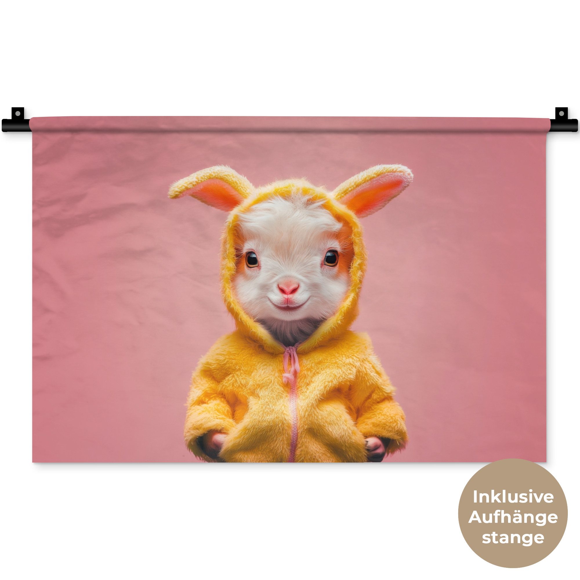 Eine kleine Ziege trägt ein kuscheliges gelbes Osterhasenkostüm mit langen Ohren. Der rosafarbene Hintergrund und der verschmitzte Blick des Tieres sorgen für eine fröhliche Osterstimmung.