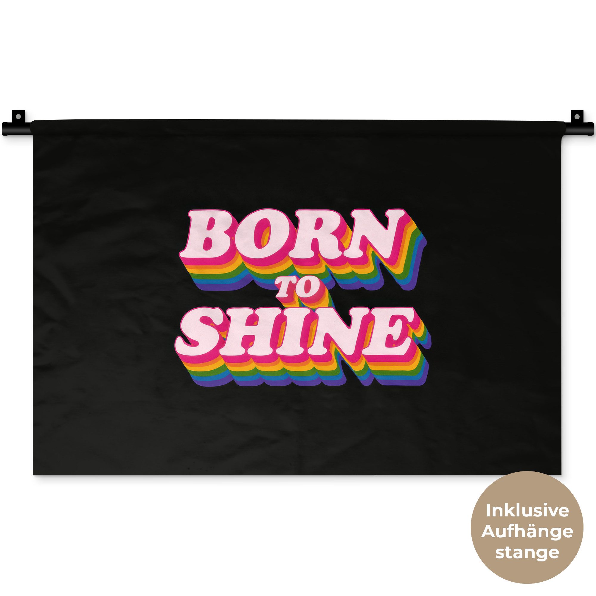 Die Worte "BORN TO SHINE" erscheinen in fetten rosa Buchstaben auf schwarzem Hintergrund. Hinter dem Text verlaufen Regenbogenfarben in Schichten, die den Wörtern einen lebendigen 3D-Effekt verleihen und eine positive, energiegeladene Botschaft vermitteln.