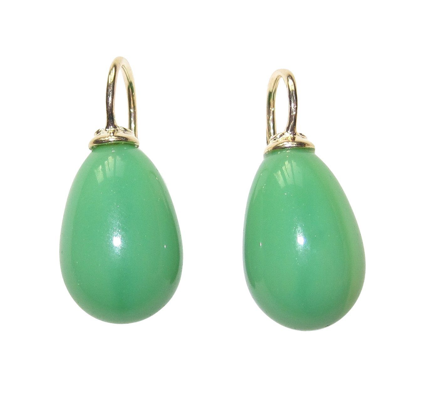 Stilvolle, trendige jadegrüne Glasohrringe in Tropfenform aus der Werkstatt der bekannten Schmuck-Designerin Heide Heinzendorff. Die hübschen, stylischen Ohrringe aus böhmischem Quarzglas werden nach alter, aussterbender Glashandwerk-Tradition in hochwertiger Handarbeit gefertigt. Jede Perle ist ein Unikat. Daher sind kleine Farb- und Formabweichungen vom Foto möglich. Der Bügel der Ohrringe besteht aus 925-er Sterling-Silber mit einer Gelbgold-Plattierung, ist antiallergisch und sehr gut verträglich. Der Bügel ist offen und kann nicht verschlossen werden. Die hängenden Tropfen-Ohrringe sind einfach anzulegen. Diese modischen und zeitlosen Ohrhänger sind leicht und liegen absolut im Trend. Es gibt sie in vielen verschieden bunten Farbtönen - in zarten Pastell-Tönen bis zu knalligen Farben. So finden Sie immer das passende Paar für jede Gelegenheit - egal ob in der Freizeit, im Alltag, im Büro oder für einen festlichen Anlass wie zum Beispiel ein Fest, eine Hochzeit, ein Ball oder auch eine legere Party. Durch ihre schlichte und einfache Form passen sie zu jedem Outfit - ob zum eleganten Abendkleid oder zum sportlichen Casual-Look. Ein klassisches, edles und modernes Fashion-Accessoire und ein schöner Allrounder für Frühling, Sommer, Herbst und Winter! Maße der Ohrringe: Höhe (ohne Gehänge): 1,7 cm, Breite: 1,2 cm.