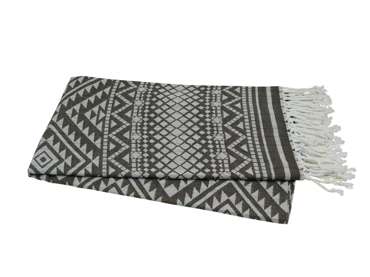 Besonderheit: Das Hamamtuch ist doppelseitig gewebt und beidseitig nutzbar. Das Muster erscheint auf der einen Seite in naturweiß/beige auf farbigem Hintergrund und auf der anderen Seite umgekehrt.
