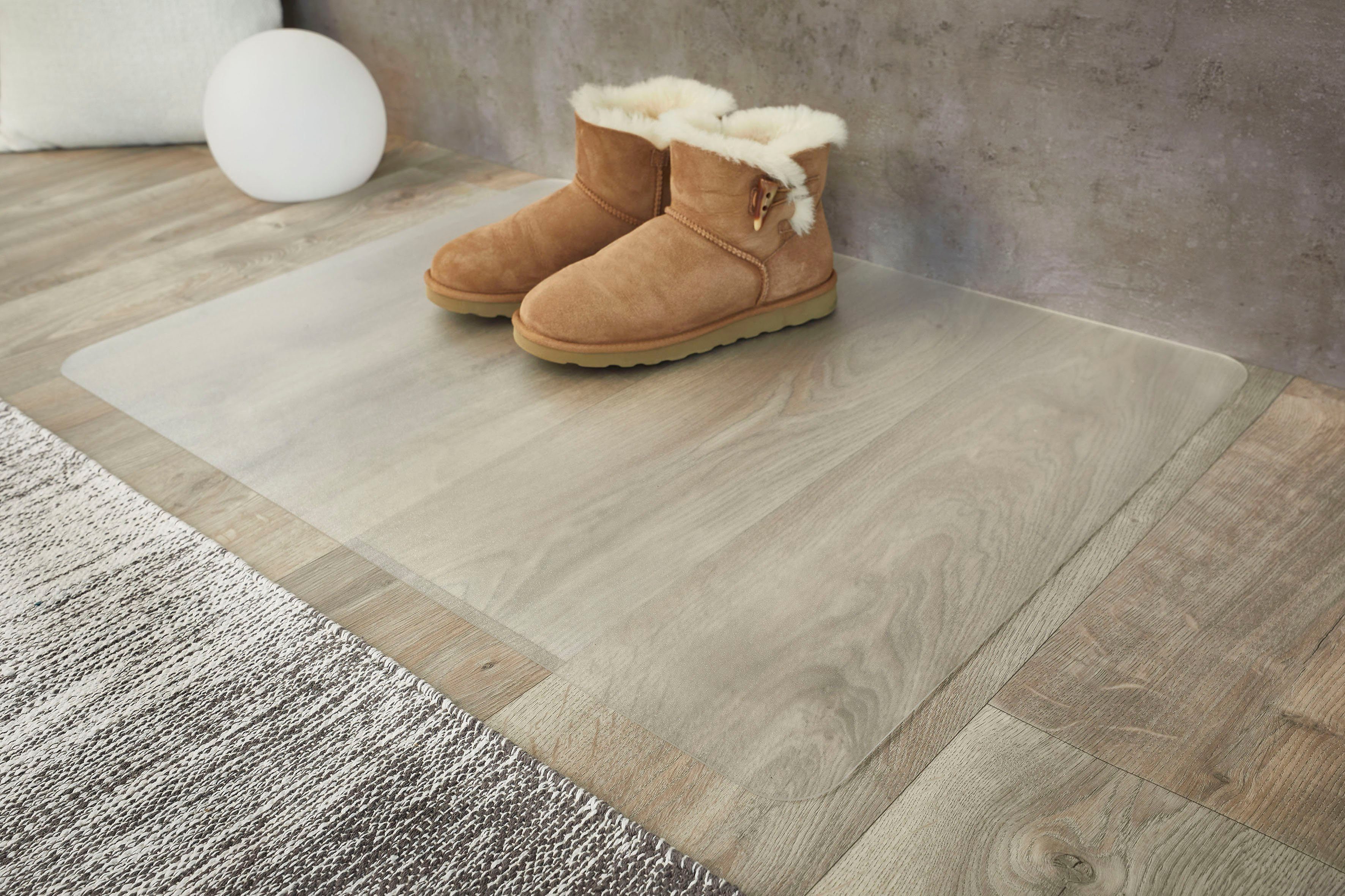 Die transparente Bodenschutzmatte »Schutzmatte« von my home vermeidet unerwünschte Kratzer und Verschmutzungen auf empfindlichen Oberböden in deinem zu Hause. Gleichzeitig stellt sie einen optimalen Gleitgrund für die Rollen eines Bürostuhls dar. Darüber hinaus ist der rechteckige Bodenschützer mit den abgerundeten Ecken ideal als Unterlage für Fitnessgeräte oder Möbel geeignet. Er ist extrem belastbar und besitzt eine Haftschicht auf der Unterseite, die ein Wegrutschen vermindert. Gefertigt ist die Matte aus Kunststoff. Sie verfügt über eine geringe Höhe, sodass sie auch unter vielen Türen und im Eingangsbereich zum Einsatz kommen kann. Durch die farblose Ausführung passt sie sich dem Untergrund optisch perfekt an. Lässt sich vielseitig im Haushalt einsetzen: die transparente Bodenschutzmatte »Schutzmatte« von my home.