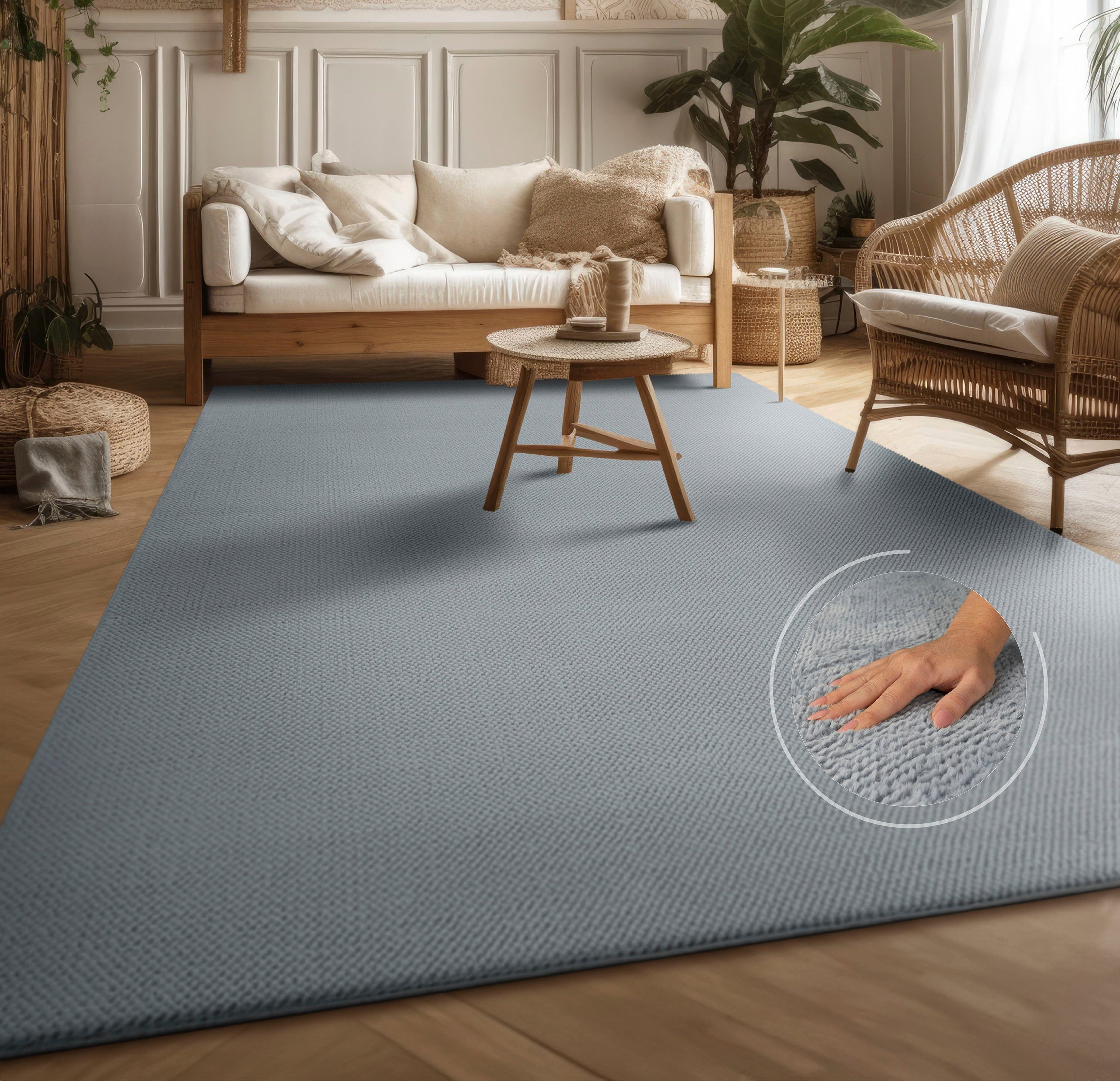 | Maschinell gewebter Teppich | Beim Auslegen des Teppichs kann durch das Aufrollen der Teppich etwas wellig erscheinen, dieses legt sich nach kurzer Zeit aus. Sie können dieses etwas beschleunigen wenn Sie den Artikel in gegenläufiger Richtung nochmals aufwickeln. |
