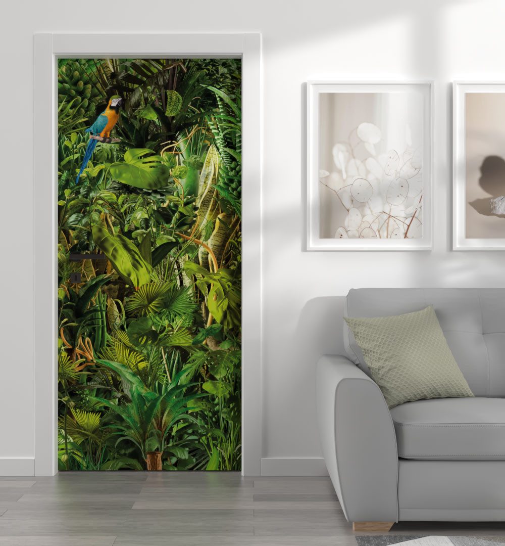 Die Türtapete Dschungel Papagei besteht aus einem qualitativ hochwertigen Vinyl Material und wird mittels moderner Digitaldrucktechnologie mit deinem Wunschmotiv bedruckt.