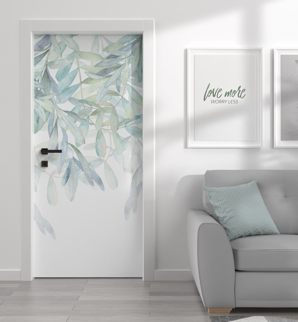 Die Türtapete Hängende Ranken mit Blätter besteht aus einem qualitativ hochwertigen Vinyl Material und wird mittels moderner Digitaldrucktechnologie mit deinem Wunschmotiv bedruckt.