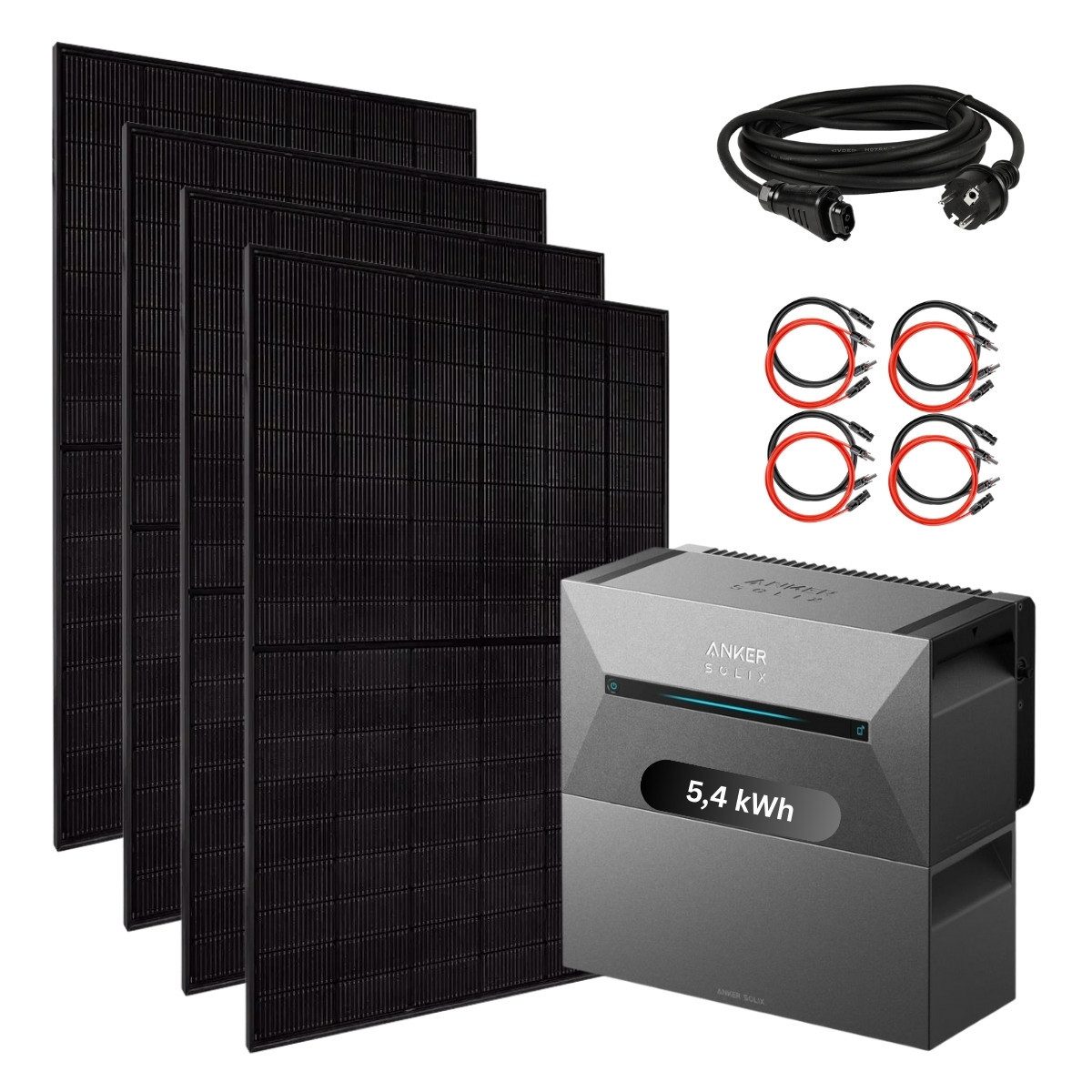 | Set beinhaltet | Speicher Anker Solarbank 3 PRO 5,4 kWh, 4x bifaziale XXL 550+ Watt Premium Hochleistungsmodule steckerfertig mit Verbindungskabel, Smartmeter ohne Aufständerung |