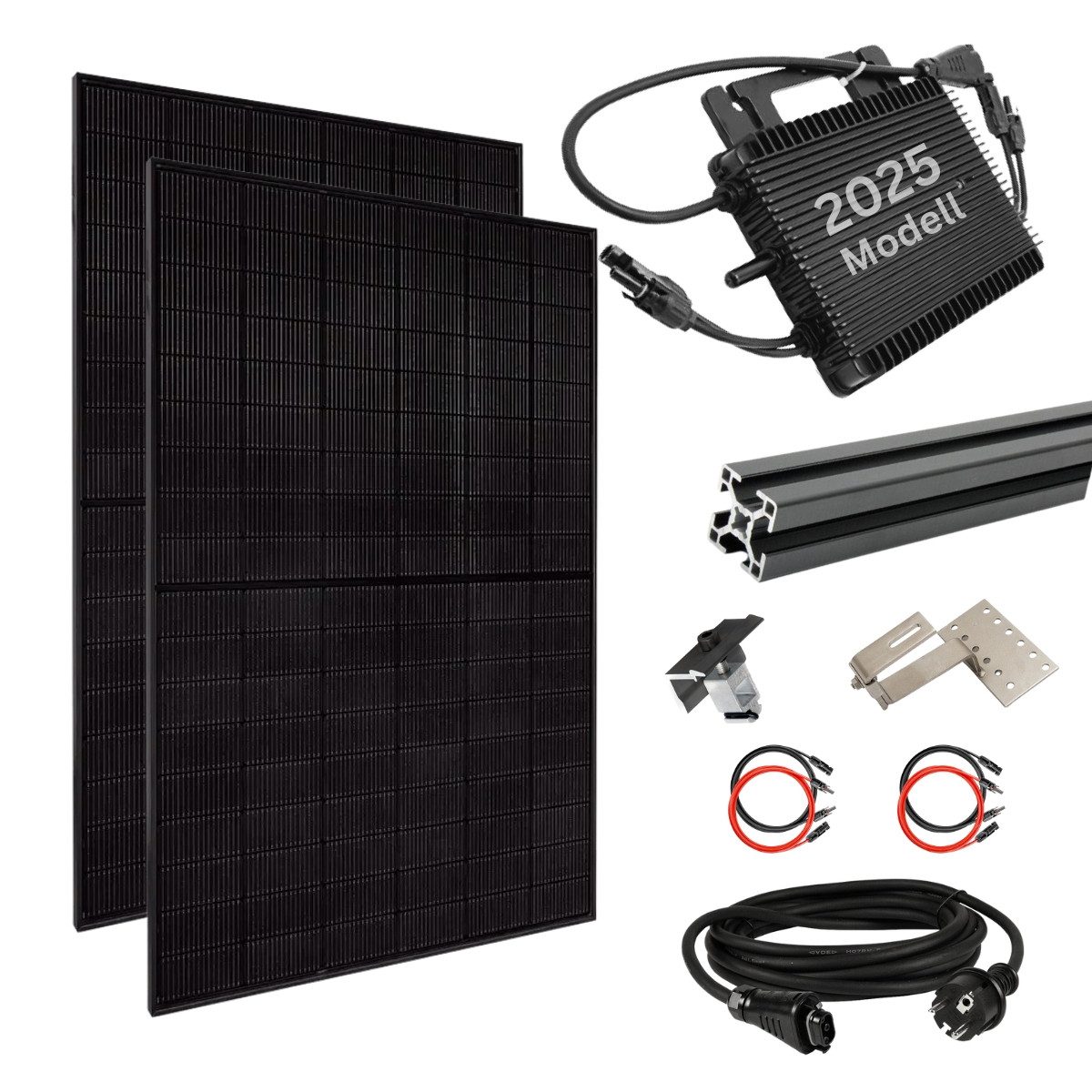 Zubehör: stabile Unterkonstruktion Made in Germany mit sämtlichen Komponenten (Stahl-Dachhaken/Modulklemmen/Alu-Schienen etc.) in schwarz dabei, WLAN Wechselrichter 800W, Kabelbinder, 2x Verlängerungskabel je 2,0 m, 1x Schutzkontaktkabel (bis 20 Meter), deutsche Anleitung